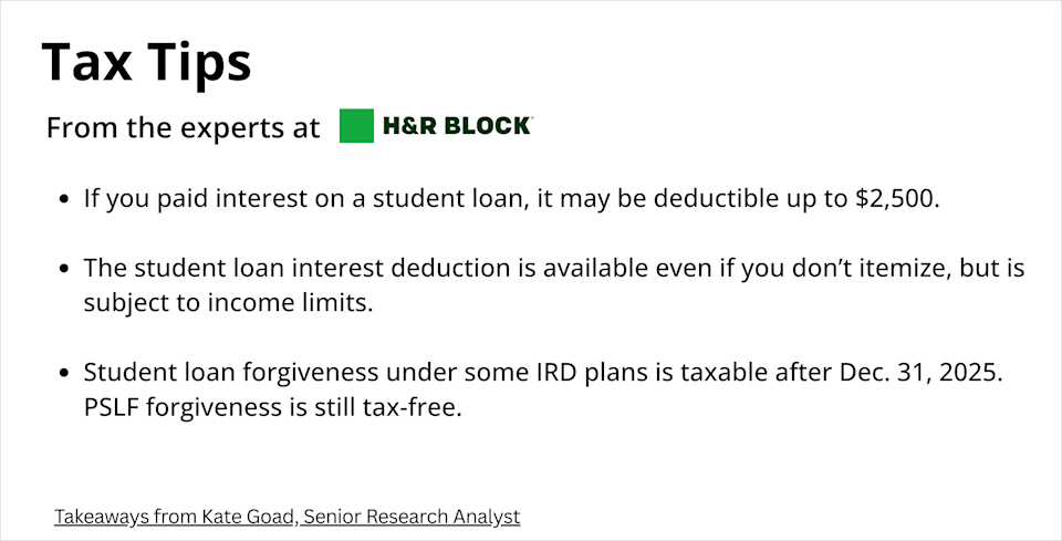 If you borrowed money for college for yourself or your child, you may be eligible for the student loan interest deduction, which can reduce your taxable income by up to $2,500. You’re only eligible for the tax deduction if you paid student loan interest during the tax year. If you didn’t make student loan payments in 2025 because your loan was in forbearance, deferment, or default, you won’t qualify to deduct student loan interest. To take advantage of the student loan interest deduction, it’s important to understand the rules. Let’s discuss eligibility requirements, income limits, and what loans qualify, as well as how the reinstatement of federal student loan payments will affect your 2025 tax return. The maximum student loan interest deduction is $2,500 or the total amount you paid in student loan interest during the 2025 tax year — whichever is less. The deduction is what’s known as an above-the-line deduction, which means you can claim it whether you take the standard deduction or itemize deductions on your return. You can deduct some or all of your student loan interest payments on your federal tax return that’s due on April 15, 2026, if you meet the following criteria for the 2025 tax year: You paid interest on a qualified student loan and were legally obligated to do so. Your tax filing status isn’t married filing separately. Your modified adjusted gross income (MAGI) is less than the thresholds listed below. Neither you nor your spouse (if you’re married filing jointly) is being claimed as a tax dependent on someone else’s return. Note that the maximum student loan interest deduction is $2,500 per tax return. If your tax filing status is married filing jointly and you and your spouse each paid more than $2,500 in student loan interest, your maximum deduction is still $2,500, not $5,000. Read more: Here are the 2025-2026 tax brackets and rates You can deduct the interest on any qualified student loan, which the Internal Revenue Service (IRS) defines as a loan taken out exclusively for higher education expenses for yourself, your spouse, or someone who was your dependent at the time you took out the loan. Both federal student loans and private student loans qualify for the deduction. The IRS only allows you to deduct student loan interest if you took on the debt for the following purposes, known as qualified education expenses: Tuition and fees Room and board, but only if the cost isn’t more than the amount included in the institution’s cost of attendance Books, supplies, and equipment Other necessary expenses, like transportation You can’t deduct the interest on money you borrowed from a relative or from a qualified employer plan, like a 401(k), even if you used it for educational purposes. If your employer offers student loan repayment assistance, you can’t use the interest they paid to incur tax benefits, including the interest deduction. However, you won’t owe taxes if your employer’s student loan assistance didn’t exceed $5,250 in 2025. You can’t take the student loan interest tax deduction if someone else is responsible for repaying the loan. Let’s say your child got an education loan in their name, but you’re making the payments. You can’t use those payments to lower your federal income tax because your child is legally responsible for the payments. (But if you’d taken out a Parent PLUS loan, you could qualify for this tax benefit because you’d be on the hook for those payments.) Likewise, if you cosigned a private student loan for someone, you wouldn’t be able to deduct loan interest unless you took over the monthly payment. That’s because the primary loan borrower is responsible for repaying the debt. The cosigner only becomes legally obligated for the debt if the original borrower defaults. The interest deduction is only permitted if no one else is claiming you as a dependent on their tax return. For example, if you’re making your student debt payments but your parents include you as their dependent when they file their tax return, neither of you qualifies for the deduction. Suppose you have $50,000 of federal student loans with an interest rate of 6%. Your monthly payment is $555. You made 12 payments in 2025. Your payments for the tax year amounted to $6,660 total, including $2,841 of interest. But you can only deduct $2,500, because that’s the maximum amount of interest the deduction allows. Keep in mind that the student loan interest deduction is a tax deduction, not a tax credit. That means it can reduce your taxable income by up to $2,500. But it doesn’t reduce your tax bill dollar for dollar by $2,500, like a tax credit would. However, if you’re still a student or you’re paying for a tax dependent’s ongoing education expenses, you may be eligible for education tax credits, like the American Opportunity Tax Credit (AOTC) or Lifetime Learning Credit (LLC). Saving on a Valuable Education (SAVE) plans are a type of income-driven repayment plan introduced by the Biden administration in 2023. Due to legal challenges and a proposed settlement, existing borrowers will need to enroll in a new repayment plan and the program is closed to new applicants. SAVE plan loans have been in administrative forbearance since mid-2024, which was originally interest-free. However, loans began accruing interest again in August 2025. If you’re enrolled in SAVE and made voluntary payments on your loan that included interest in 2025 — including if you made interest-only payments — you can deduct up to $2,500 of interest payments if you meet the other requirements. As part of a settlement reached in December 2025, the Education Department agreed not to enroll new borrowers and to move existing borrowers in new repayment plans. Deducting the interest you paid on your student loans is a simple process. Your student loan servicer will typically send you Form 1098-E tax form if you paid more than $600 in interest for the tax ye