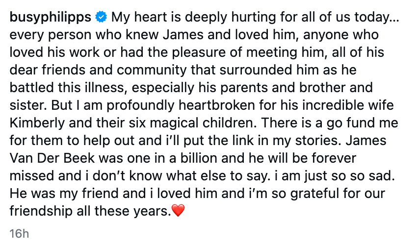 Katie, who played James’s on-screen love interest Joey Potter, shared a photo of a moving handwritten letter she addressed to the late "Dawson’s Creek" star. “Bravery. Compassion. Selflessness. Strength. An appreciation for life and the action taken to live life with the integrity that life is art — creating a beautiful marriage, six loving children — the journey of a Hero,” she said. “To our extended Dawson’s Creek family of friends … please be respectful of our silences at the moment as Beautiful Kimberly and family have asked for peaceful privacy for now,” she added. Indeed, Kimberly revealed that her friends had started a GoFundMe to support her and her children. It has currently garnered over $1.2 million. “I’m heartbroken for everyone who loved him, especially his beautiful family. My prayers are with them,” she said. “I will always be grateful that I got to stand in his light for a little while. That I got to laugh with him, go to prom with Dawson and grow up alongside him. He will live on in our memories, and in the kindness he left behind. Rest in Peace, my friend.”