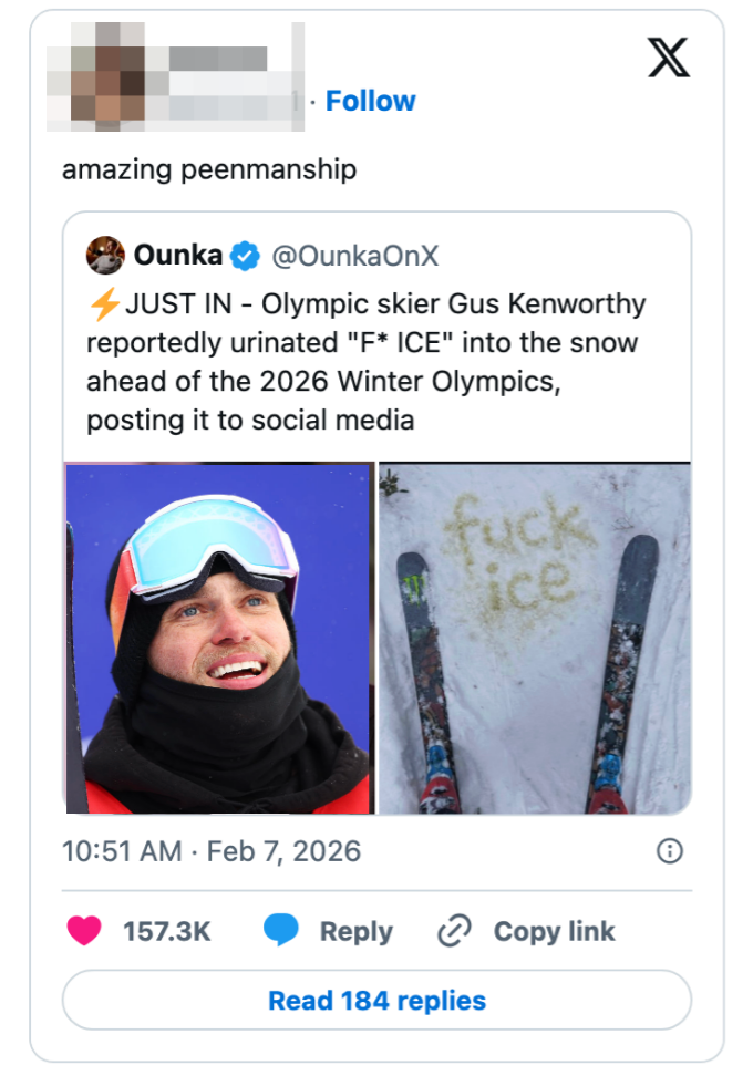 "People out here worried about how American athletes represent America but not worried about how the President represents America." Editor's Note: While we can't endorse what X has become, we can bring you the worthwhile moments that still exist there, curated and free of the surrounding chaos. The stock market is up so we don’t have to prosecute pedophiles is one of the worst political messages i have ever heard. https://t.co/Bjj7gPFYw6 The United States is one of the few world governments that does not directly fund it’s Olympic team. It is fully funded by corporate sponsorships and private donations.Which means our athletes don’t represent the American government.They represent the American people. https://t.co/BokJmTBqv9 lmfao no the fuck you are not https://t.co/eA1xGbjLxB Note: The image of Gus in the original tweet was replaced here due to photo rights. Note: The image in the original tweet was replaced here due to photo rights. Ladies and gentlemen our health secretary https://t.co/JqqNSnJN72 Note: The image of Epstein in the original tweet was replaced here due to photo rights. Watters: I was walking in my street, a car drives by and I give him a wave. He rolls down the window and says, “F U fascist.” He doesn’t know I’m a fascist!Jessica: Yes, he does. You’re on TV. pic.twitter.com/QIB4uOg6oj Note: The image of Jake in the original tweet was replaced here due to photo rights. Rep. Becca Balint: This is not a game, Secretary.Pam Bondi: I'm Attorney GeneralBalint: My apologies, I couldn't tell. pic.twitter.com/wY8GxHOEvl Note: The image in the original tweet was replaced here due to photo rights. same party that spent 15 years crying about participation trophies https://t.co/nFMeBA6hf3 Moskowitz: "Trump's name appears more times in the Epstein files than God's name appears in the book about God" pic.twitter.com/RyFb7MZIqg I was in Dollar General last week and bought a Snickers for $1.85. A year and a half ago it was $7 in the Airport https://t.co/DEJe5abuXL For more political tweets, check out our most recent roundup: "No One Even Knew Who The F—ck She Is": 29 Of The Very Best, Most Brutal, And Sometimes Funny Political Tweets Of The Week