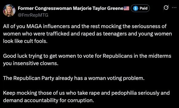 Former Rep. Marjorie Taylor Greene (R-Ga.) on Sunday warned Republicans that right-wing influencers trying to downplay the Jeffrey Epstein files are going to cost the party in November. “All of you MAGA influencers and the rest mocking the seriousness of women who were trafficked and raped as teenagers and young women look like cult fools,” she wrote on X. “Good luck trying to get women to vote for Republicans in the midterms you insensitive clowns.” Greene said the GOP already has a problem drawing women to the party. This, she said, won’t help. “Keep mocking those of us who take rape and pedophilia seriously and demand accountability for corruption,” she sarcastically advised. Trump was once close friends with Epstein, a sex offender who died in jail in an apparent suicide in 2019. In 2024, Trump and those around him promised to release files related to the case if he won the election. After he did, his administration held a White House event to give a group of MAGA influencers large binders of supposed files ― but it quickly became clear that most of those documents had already been released. Trump and his administration then spent much of the rest of the year trying to stonewall the release of additional files. Attorney General Pam Bondi, who at one point suggested she had a list of Epstein clients on her desk ready to be released, later said there was no such list and no further documents to release. Greene ― who had been a staunch Trump supporter and MAGA believer who frequently appeared with the president at campaign events ― joined a small group of Republican lawmakers to push for the full release of the Epstein files. Trump was reportedly not happy. Greene’s stance led to a break between the two, with Trump publicly attacking her as a “traitor.” As Trump’s MAGA allies also turned on Greene, she appeared to reevaluate her former approach, apologizing for her role in what she called “toxic politics” and calling for more kindness. Last month, she declared that MAGA “was all a lie.” By entering your email and clicking Sign Up, you're agreeing to let us send you customized marketing messages about us and our advertising partners. You are also agreeing to our Terms of Service and Privacy Policy.