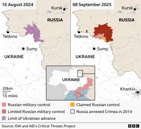 The war in Ukraine is about to enter its fifth year. Over the past year, Russian forces have slowly expanded the amount of territory they control, mostly in the east of Ukraine, and have continued their barrage of air strikes on Kyiv and other cities. Some 55,000 Ukrainian soldiers have been killed, according to Ukrainian President Volodymyr Zelensky, while the BBC has confirmed the names of almost 160,000 people killed fighting on Russia's side. With the fourth anniversary of the Russia's full-scale invasion approaching, here's a look at the situation on the ground in Ukraine. Analysts at the US-based Institute for the Study of War (ISW), say Russia took about 4,700 sq km (1,800 sq miles) of territory in 2025 - an area about twice the size of the city of Moscow - although Russia claims to have taken 6,000 sq km. In eastern Ukraine, Moscow's war machine has been churning mile by mile through the wide open fields of the Luhansk and Donetsk regions - also known as the Donbas - surrounding and overwhelming villages and towns. It has been trying to gain full control of the area along with two more regions to the west - Zaporizhzhia and Kherson. Shortly after the invasion, Russia held referendums to try to annexe all these regions - in the same way it had annexed Crimea in 2014 - but it has never had them under full control. There is some evidence that Elon Musk's decision to deny Russian forces access to his Starlink satellite-based internet service at the start of February has given Ukraine an advantage. Ukraine requested the move as evidence grew that Starlink was enabling Russian forces to mount increasingly accurate attacks, including multiple instances of units being attached to drones, allowing operators to use real-time video links to guide drones on to targets. In some areas of the long front line, especially east of the city of Zaporizhzhia, Russian forces appear to have been forced to retreat. Ukraine hopes that any territorial gains will strengthen the its position at the negotiating table. It comes after a US-backed peace plan unveiled in November, suggested Ukraine could cede control of all of Luhansk, Donetsk and Crimea, along with the areas of Zaporizhzhia and Kherson that Russia currently occupies, to Moscow. Ukrainian forces would have had to withdraw from parts of Donetsk they still hold and this would become a demilitarised area under de facto Russian control. Russian forces would withdraw from the small areas of Ukraine they currently occupy outside those regions. Zelensky has consistently said Ukraine will not hand over the Donbas in exchange for peace, saying such a concession could be used as a springboard for future attacks by Russia. A recent report by the ISW describes a "fortress belt" running 50km (31 miles) through western Donetsk. "Ukraine has spent the last 11 years pouring time, money, and effort into reinforcing the fortress belt and establishing significant defence industrial and defensive infrastructure," it writes. A Russian summer offensive near the eastern town of Pokrovsk did make rapid advances just north of the town and Russia has recently made advances in the town itself and to the east of nearby Kostyantynivka. The town, once a key logistics hub for Ukraine's military, is already in ruins. Russian officials previously claimed to have captured Pokrovsk, known in Russian as Krasnoarmeysk, which includes a major road and railway junction that used to connect the upper parts of the Donetsk region with key cities to the west, such as Dnipro. But Ukraine says it still holds northern parts of the town. Its fall would be Russia's biggest battlefield victory since it took the city of Avdiivka about 40km (25 miles) to the east in early 2024 and could give Moscow a platform to drive north towards the two biggest remaining Ukrainian-controlled cities in the Donetsk region, Kramatorsk and Sloviansk. Ukraine is losing ground, but the ISW notes Russia has been trying to take Pokrovsk - a town of about 23 sq km - for nearly two years and that the cities in the fortress belt are "significantly larger". It suggests that it would take Russian forces another two years to seize the remainder of the Donetsk region "at great cost". Further north on the main front line, Russia has been trying to advance on the city of Kupyansk, which analysts suggest could allow it to encircle the northern Donetsk region. It has also been trying to push Ukrainian forces back from the border with the Russian region of Belgorod. ISW analysts say Russia is trying to create a buffer zone inside Ukraine's northern borders and get within artillery range of Kharkiv, Ukraine's second-biggest city. Russia's forces have recently gained limited control over a spear of land to the south of Vovchansk that would bring them closer to this target. Russian President Vladimir Putin says he wants this buffer zone to protect Russia, after Ukrainian forces captured a swathe of territory further north in Kursk in the summer of 2024. Russian forces eventually drove them out, with the help of North Korean troops. As well as the counter-offensive in the Kursk region, Ukraine has struck air bases deep inside Russia. One of these attacks involved using 100 drones to target nuclear-capable long-range bombers. The Russian Defence Ministry confirmed the attacks had occurred in five regions of Russia - Murmansk, Irkutsk, Ivanovo, Ryazan and Amur - but stated planes had been damaged only in Murmansk and Irkutsk, while in other locations the attacks had been repelled. Most recently, an overnight Russian attack was reported on 22 February in Kyiv and around the capital city, where dozens of strikes targeted energy infrastructure. Prior to this, a massive attack by Ukrainian drones on Volzhsky, in the Volgograd region in Russia, was reported on 11 February. Deep strikes are seen as a critical part of the war - Ukraine is trying to target Russia's war economy to slow the advances on the front line. Russia has also been carry