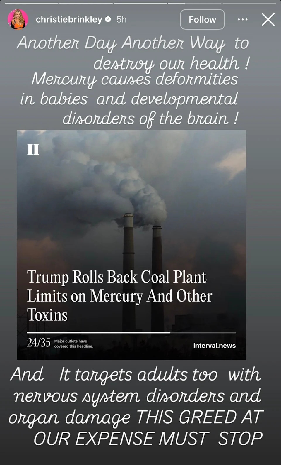 There is no love lost between Christie Brinkley and President Donald Trump, and she is not even subtle about it. After the intentions of Trump's administration on environmental regulations relating to coal and mercury emissions made headlines, the author wasted no time in raising her voice, assigning the blame, and highlighting the negative impacts to ensue. One thing Christie Brinkley will not do is watch in silence. She previously expressed her concerns about the issues with the environment when Donald Trump won the presidential elections in 2024. Brinkley seems distraught about the Trump administration's decision to ease pollution standards for limits on mercury from coal plants, and she has shared a piece of her mind. The author took to social media, writing that this environmental update is set to destroy lives. She noted the pressing side effects that will occur, affecting the fragile population, on her Instagram Stories. "Mercury causes deformities in babies and developmental disorders of the brain!" she penned over a screenshot of the headline from Interval News. In another slide, still on her stories update, she shared a quote which read "'I CAN DO ANYTHING I WANT TO DO TO THEM. I'M ALLOWED TO DESTROY THE COUNTRY.' -Donald Trump 2/20/26." To this, she added a footnote praising him for keeping up to the words in the quote. "And I must say he is doing a good job of destroying the country," the model shared after stating that the regulations not only put babies at risk, but they target adults too, affecting their nervous systems and ultimately causing organ damage. Brinkley claims Trump's decision is at the expense of the citizens and stems from greed.Β While the Trump administration views rolling back the clean air regulations from an economic standpoint, public health groups and environmental agencies warn that the health of the masses will bear the brunt. The announcement was made on Friday, February 20, 2026, stating that it will roll back clean air regulations limiting mercury and hazardous toxins from power plants. They shared that it will boost baseload energy. President Donald Trump's Environmental Protection Agency explained that easing the pollution standards would alleviate costs for utilities that run older coal plants. The effectiveness of this move shines at a time when demand for power is massively increasing, with the expansion of data centers used for artificial intelligence. Reuters reports that environmental groups have stated that allowing mercury, which is a neurotoxin capable of impairing brain development in babies, to be freely emitted into the air will result in higher health-related costs. Brinkley particularly noted earlier that the administration has set out to undo the environmental protection regulations put in place by Joe Biden's administration. The Swimsuit model added that the effects on the climate and health will surely take a devastating turn as a result. The Daily Mail shared that Brinkley wrote on social media, telling her followers that natural disasters and diseases will all intensify if the state of the planet is not placed at the top of a Scale of preference over profits for a handful of greedy corporations. She acknowledged that while the effects of climate change are already being felt, working together in prioritizing the environment will go a long way to slow down or ultimately stop the blistering negative effects. Brinkley called for support from her online community, stating that nature does not have respect for race or skin color, as no one will survive without a healthy biodiverse environment. The actress also admitted that the changes will not only affect the current population but also future generations as well. "For the sake and well-being of our children, action is mandated," her words echoed. Big stars in the music industry like Taylor Swift and Billie Eilish endorsed Trump's opponent, Kamala Harris, during the 2024 presidential elections. After it was announced that Trump won, Eilish called his victory a "war on women," seemingly referring to his take on female reproductive rights. Queen of Pop, Madonna, also expressed her views on the outcome of the election, uploading a photo on Instagram showing a cake with the words "F-ck Trump," adding that she stuffed her face with it after the results were announced. Madonna also shared that she was "trying to get her head around why a convicted felon, rapist, and bigot was chosen to lead the country because he's good for the economy?" Cardi B, along with other celebrities such as Christina Applegate and Lili Reinhart, also slammed his election win. The president also faced heat from the media as many voiced out their disappointment with the election results. Besides Brinkley's concerns with climate change and environmental regulations, she previously spoke out against Donald Trump, claiming that he had flirted with her when he was married to his first wife, Ivanna. Brinkley is all about effecting change in the environment and saving Mother Earth from devastating ruin. Still, an aspect of her life saw a painful nosedive, and it was not triggered by environmental destruction. In her memoir "Uptown Girl," released last year, she recounts the pain she went through when she discovered her fourth marriage had hit the rocks. She detailed how she discovered her ex-husband, Peter Cook, had cheated on her leading to the end of their eight-year marriage. The Blast reported that she described the relationship as the "most tortured relationship" she ever had. It was revealed to her that her then-husband was having an affair with a teenage girl. Upon searching their family computer, she further discovered some incriminating proof and adult content, as well as several explicit photos. The shock she felt was overwhelming when her eyes were met with the truth, and she ultimately decided the union could not continue. Will Christie Brinkley's voice cause a positive turnaround for the environment?