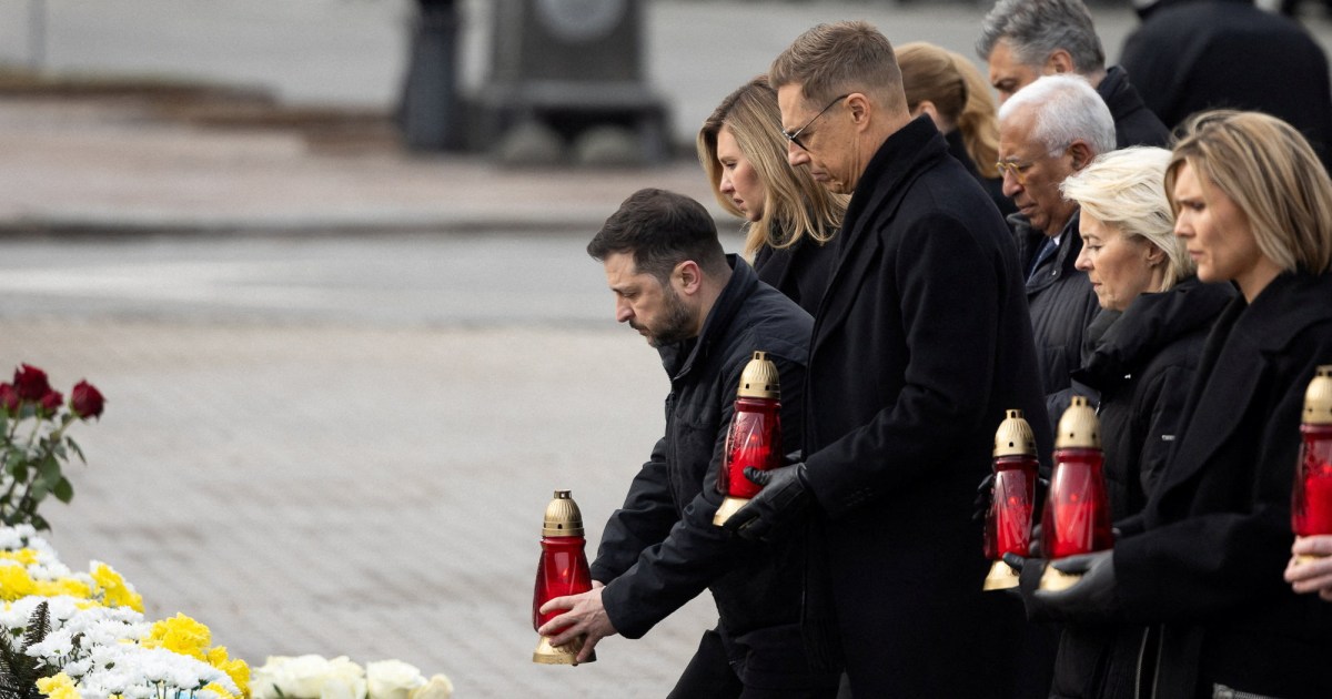 European leaders travel to Kyiv to mark the war’s fourth anniversary and pledge continued support for Ukraine. Share Save Ukrainian President Volodymyr Zelenskyy has praised Ukrainians for withstanding four years of Russian attacks with “immense courage”, saying Moscow has failed to break their spirit or win the war it started. Zelenskyy delivered the remarks on Tuesday in an address marking the anniversary of Russia’s full-scale invasion on February 24, 2022, as Ukraine endures punishing winter attacks on its energy grid and struggles to make progress in peace talks. “We have every right to say: We have defended our independence. We have not lost our statehood,” Zelenskyy said. “[Russian President Vladimir] Putin has not achieved his goals. He has not broken Ukrainians. He has not won this war.” In a show of support, more than a dozen senior European officials – including European Commission President Ursula von der Leyen, Finnish President Alexander Stubb and seven prime ministers – travelled to Ukraine’s capital, Kyiv, to mark the anniversary of the conflict. The war has killed hundreds of thousands of people, upended life for millions of Ukrainians and sparked far-reaching security concerns across Europe. The number of soldiers killed, wounded or missing on both sides could reach two million by spring, analysts say. The European Union pledged continued “political, financial, economic, humanitarian, military and diplomatic support” for Ukraine. Von der Leyen said the bloc will deliver one way or another on a planned 90-billion-euro ($105bn) loan for Ukraine, which has so far been blocked by Hungary. Leaders of the Group of Seven powers, which include the United States, also reaffirmed their “unwavering support for Ukraine”. In a joint statement, they threw their weight behind ongoing peace negotiations led by US President Donald Trump, which they said Europe had a “leading role to play in”. More than 30 leaders in the “Coalition of the Willing” supporting Ukraine called for Russia to agree to an “unconditional ceasefire”. Al Jazeera’s Audrey MacAlpine, reporting from Kyiv, said the core of Zelenskyy’s message was the Ukrainian people “have a right to defend themselves and their independence, especially when that independence is being called into question now amid the ongoing peace negotiations”. Russia now controls 19.5 percent of Ukraine’s territory, including 7 percent it took before the 2022 full-scale invasion. But its progress has been slow and painstaking since 2023, morphing into a bloody battle of attrition centred on the mineral-rich Donbas region of eastern Ukraine, which Moscow wants to annex. According to the Institute for the Study of War, a Washington, DC-based think tank, Russian forces captured 0.79 percent of Ukrainian territory in the past year of fighting, their largest advance since 2022. Russian and Ukrainian officials began their first direct talks, mediated by the US, in January but appear to remain deadlocked on major issues of territory and security guarantees for Ukraine. Moscow wants Kyiv to cede control of the Donbas, its industrial heartland, which Moscow mostly occupies but has failed to seize completely. Ukraine has rejected that demand and said it will not sign a deal without security guarantees from its allies, including the US, to deter a future Russian invasion. There is no date set for the next round of talks, but an aide to Zelenskyy said they could take place at the end of the week. Zelenskyy on Tuesday said Ukraine is ready to do “everything” it can to secure peace but won’t “betray” the price paid by Ukrainians throughout the conflict. “We want peace – strong, dignified and lasting peace,” he said, adding that any agreement “must not simply be signed. It must be accepted by Ukrainians.” “We cannot, we must not, give it away, forget it, betray it.” In a video address to the European Parliament, Zelenskyy called on the EU to accelerate Kyiv’s admission to the union. Yuriy Sak, a former adviser to Ukraine’s defence minister, told Al Jazeera that “Ukraine should not be giving up anything” further in the negotiations because it already has made more concessions than Ukrainians wanted. He accused Russia of holding onto a “maximalist and unrealistic” position. “Therefore, unfortunately at this stage, the peace process has not produced the results that Ukraine wants, that the world wants,” Sak said. “Because we see Russia’s unwillingness to approach the negotiating process in good faith, we continue to build up our defence industry. We continue to strengthen our Euro-Atlantic alliances.” The Center for Strategic and International Studies think tank estimated that Russia has suffered 325,000 soldier deaths from February 2022 to December 2025 – the largest number of soldier deaths for any major power in any conflict since World War II. The Kremlin acknowledged it has not fully achieved its war goals and said it would continue fighting until it does. In a televised address, Putin said Ukraine and its allies are “pushing themselves to the edge” in their determination to defeat Moscow, a move he said they will “regret”. Al Jazeera’s Yulia Shapovalova, reporting from Moscow, outlined Russia’s endgame. “It wants the entirety of Donbas, plus Zaporizhia and Kherson, to be recognised as Russian. It wants to continue pressuring Ukraine, and it’s not going to give up. Obviously, Ukraine doesn’t want to give up its territories either.” Foreign policy analyst Andrey Kortuno said Russia’s leaders would benefit from such territorial concessions. “Of course, it is something the Russian leadership can claim as a victory – that Russia will have four more regions and an additional couple of million people,” he told Al Jazeera. The mood on the streets of Kyiv on Tuesday was subdued with a few dozen people gathering at a ceremony in the central squa