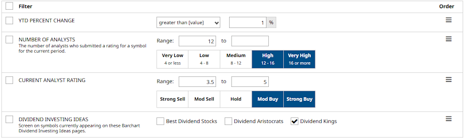 Consistency builds wealth. But consistency combined with momentum can be even more powerful. Dividend Kings are the gold standard for long-term dividend growth, having raised their payouts for at least five decades through multiple economic cycles. It might be boring for some, but it is the type of boring that builds a strong income-growth portfolio. When some of these same companies are also delivering strong year to date gains and earning favorable analyst ratings, it highlights businesses that are not only reliable but also currently in demand. That is exactly the type of setup I set out to find. Claude Just Dealt Another Blow to IBM Stock. Will It Be Fatal, or Should You Buy the Dip? This Blue-Chip Stock Just Slashed Its Dividend by 50%. Should You Run Away Now? 3% Yield and 93% Upside: This Dividend Stock Could Offer a Lifetime of Income Stop Missing Market Moves: Get the FREE Barchart Brief – your midday dose of stock movers, trending sectors, and actionable trade ideas, delivered right to your inbox. Sign Up Now! Using Barchart’s Stock Screener, I selected the following filters to get my list: YTD Percent Change: 1% or more. It limits the results to stocks that grew year-to-date. Then I will sort the list from highest to lowest. Number of Analysts: 12 or more. A high number of analysts offers a stronger conviction. Current Analyst Rating: Stocks that are well-liked by Wall Street, giving them a “Moderate” or “Strong Buy” rating. Dividend Investing Ideas: Dividend Kings. I set these filters, ran the screen with 18 results, and I'll cover three companies with the highest year-to-date percent change. Let’s start with the first Dividend King: Colgate-Palmolive is a global consumer products company that manufactures everyday essentials, including toothpaste, toothbrushes, soap, pet food, and cleaning products. Sold in more than 200 countries, there is a good chance that at least one is sitting in a household cabinet right now. In its recent financial results, the company reported sales rose 6% YOY to $5.2 billion. Meanwhile, its net income fell a whopping 2150%, resulting in a $36 million net loss due to restructuring and impairment expenses. These scenarios typically occur when companies realign operations or streamline costs, which, in my opinion, is a positive. Fix what's broken. Colgate-Palmolive has increased its dividends for 63 consecutive years. Today, it pays a forward annual dividend of $2.08, translating to a yield of approximately 2.12%. Further, the stock is up 24.16% year-to-date, the highest among my list of Dividend Kings. While a consensus among 21 analysts rates the stock a “Moderate Buy”, there's as much as 7% upside if it hits its high target price of $105. PPG Industries is a global manufacturer of paints, coatings, and specialty materials used in homes, buildings, automobiles, and industrial equipment. Its coatings help protect and finish everything from residential walls to commercial aircraft. In its recent financial report, sales were up 5% YOY to $3.9 billion, and net income bounced back from a loss, up 207% to $300 million, which is pretty impressive. PPG Industries also increased its dividends for 54 consecutive years. Currently, it pays a forward annual dividend of $2.84, translating to a yield of around 2.26%. And year-to-date, the stock is up 22.54%. A consensus among 24 analysts rates the stock a “Moderate Buy” and suggests there could be a 12% upside should it hit its target high of $140. Sysco Corp is a global food distribution company that supplies restaurants, hospitals, schools, hotels, and other foodservice operators. With operations spanning multiple countries, it delivers the ingredients and kitchen essentials that help keep commercial kitchens running every day. In its recent quarterly results, the company reported that sales increased 3% YOY to $20.8 billion. Meanwhile, net income decreased 4.2% to $389 million due to higher operating expenses. Sysco increased its dividends for more than 50 consecutive years, and today pays a forward annual dividend of $2.16, translating to a yield of approximately 2.4%. Meanwhile, Sysco stock is up 21.96% since the start of the year. Finally, a consensus among 17 Wall Street analysts rates the stock a “Moderate Buy”, with potential 13.3% upside if the stock manages to achieve its target price of $102. These three Dividend Kings prove that stability does not have to be boring. While the year-to-date performance continues to attract attention, what made them popular in the first place is decades of consistency and reliability. And remember, these companies are invested in not just because of short-term gains, but also for their ability to thrive even in the toughest markets. On the date of publication, Rick Orford did not have (either directly or indirectly) positions in any of the securities mentioned in this article. All information and data in this article is solely for informational purposes. This article was originally published on Barchart.com