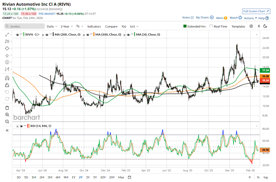 Rivian's (RIVN) stock has looked weak over the last few trading sessions and has pared some of the gains following an impressive Q4 2025 earnings report last week. Electric vehicle (EV) stocks have been out of favor with investors for quite some time, and even Tesla (TSLA) has stopped talking less about electric cars as it positions itself as an artificial intelligence (AI) play. Rivian, along with Lucid Group (LCID), remains among the rare breed of U.S. EV startups that survived the slump, and most others have either gone out of business or simply become irrelevant. Rivian, which rallied last year, is currently down over 21% for the year. Let's look closer at RIVN’s 2026 forecast, which management sees as an “inflection year” as the company prepares to launch its R2 vehicles in the second quarter of the year. Micron Stock Trades Near Record High — Cash Out or Hold On? Microsoft Stock Just Flashed an Ultra-Rare Bullish Signal for Options Traders Western Digital Is Selling Sandisk Stock. Should You? Get exclusive insights with the FREE Barchart Brief newsletter. Subscribe now for quick, incisive midday market analysis you won't find anywhere else. Let’s begin by looking at a snapshot of Rivian’s Q4 earnings. It reported revenues of $1.29 billion and an adjusted per-share loss of 54 cents in the quarter, with both metrics coming in better than Street estimates. Its 2025 revenues rose 8% year-over-year (YoY), and importantly, it generated a gross profit of $144 million as compared to a gross loss of $1.2 billion in the previous year. While Rivian’s core automotive business is still not profitable on a gross profit level, regulatory credit sales and a software partnership with Volkswagen (VWAGY) helped it achieve this feat on a company level. Meanwhile, Rivian expects the launch of R2 to negatively impact its gross margins in the second and third quarters of this year. It expects things to improve in the final quarter as that model ramps up production. However, regulatory credit sales might remain a headwind as legacy automakers don't necessarily need to buy these following the easing of Corporate Average Fuel Economy (CAFE) standards by the Trump administration. Rivian sees its 2026 deliveries rising to between 62,000 and 67,000 units, with the top end of the guidance implying a 59% annual increase. A lot, however, would rely on the reception its affordable R2 vehicles receive from buyers, as sales of premium R1 vehicles have sagged. Sell-side analysts had an unusually divergent reaction to Rivian’s Q4 earnings, though. Wells Fargo, TD Cowen, and Stifel raised their target prices, while Piper Sandler lowered its from $20 to $18. Deutsche upgraded RIVN to a “Buy” and raised its target price to $23, while UBS—which had downgraded the stock to a “Sell” in January—upgraded it to a “Neutral” while raising its target price to $16. D.A. Davidson, meanwhile, downgraded the stock from a “Neutral” to “Underperform” while slashing its target price by $1 to $14. Overall, RIVN stock has a consolidated rating of “Hold” from the 23 analysts polled by Barchart, while its mean target price of $17.71 is over 17% higher than current price levels. During the Q4 earnings call, CEO RJ Scaringe termed 2025 as a “foundational year” for the company and said that he believes the current year will be an “inflection point for our business.” CFO Claire McDonough, meanwhile, sees 2026 as a “transition year for the Automotive segment's profitability” as the company ramps up R2 production. While I am not giving up on RIVN stock yet, I capitalized on the rally last year to book profits and trimmed my positions. I continue to believe that Rivian offers a good value proposition to customers, and no wonder Volkswagen chose it as a partner. The German auto giant also bet on Chinese EV company XPeng Motors (XPEV), which has Tesla-like ambitions and has tasted success with its new affordable models. Rivian is also pivoting to affordable cars, which is not a bad strategy. The problem, however, is that companies across the EV spectrum—from U.S. EV giant Tesla to fellow EV startup Lucid Motors and even legacy automaker Ford (F)—are doing the same thing. Ford is incidentally looking to build a $30,000 electric pickup truck, which would be available in showrooms next year. Importantly, Ford expects the new models to be profitable from the start. The affordable EV segment in the U.S. might also soon get crowded with multiple models from different automakers. Given the current state of the U.S. EV industry, which is characterized by tepid demand and production overcapacity, I am not too bullish on the sector, especially after the withdrawal of the EV tax credit by the Trump administration. The U.S. EV industry would need policy support to spur adoption—something we might not see under the current administration. Overall, given the sorry state of affairs in the U.S. EV industry, I remain cautious on the sector, especially as the tech selloff has created attractive opportunities elsewhere. On the date of publication, Mohit Oberoi had a position in: F, XPEV, RIVN, TSLA. All information and data in this article is solely for informational purposes. This article was originally published on Barchart.com