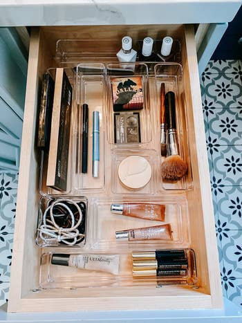 Promising review: "I needed to organize all the stuff that ends up in the bathroom vanity cabinet. These were perfect in every way. Being clear, it is easy to see what is in each bin. Assorted sizes made it easy to sort out what I had and make the best use of the space. The bins are beautifully made and look great on a shelf, in a drawer, in a cabinet, or even on the countertop. I would definitely buy again and have already suggested them to my friends. Happy to find quality products that are Made in the USA!" —Linda