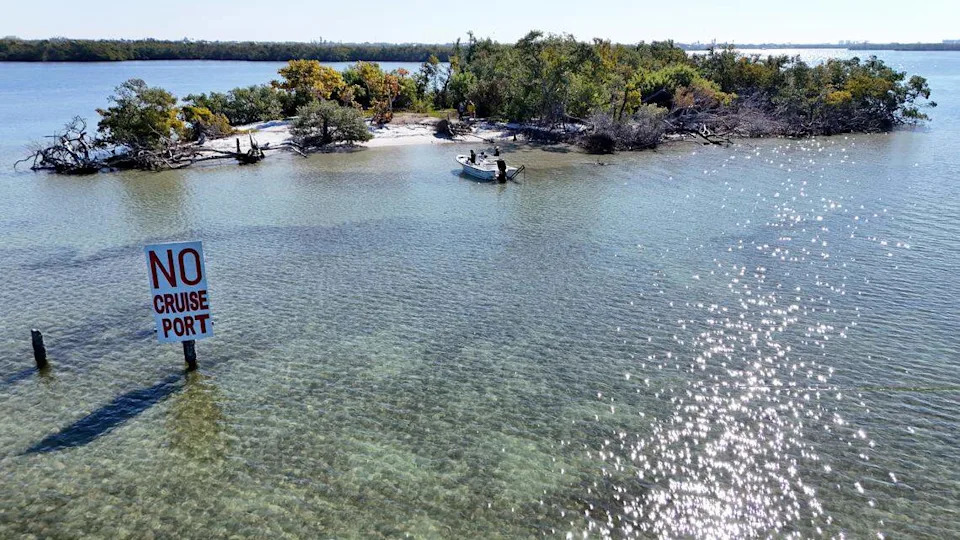 Just offshore Paradise Island, a recently placed sign reflects that sentiment, reading simply: “NO CRUISE PORT.”