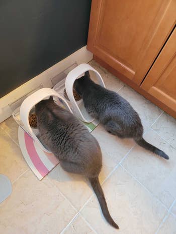 BuzzFeed editor Jenae Sitzes says, "I've had my microchip pet feeders from Sure Petcare for a couple of months now, and while it was a pricey investment, it's been worth every single penny and has alleviated a ton of stress around my cat's meals. One of my cats, Sneaky, always wants to eat his brother's food and has a tendency to be overweight. Separating them for meals just wasn't working — they would whine at the door and simply not eat enough unless they could eat side by side and have free access to food throughout the day — but I also couldn't be sure that my younger (and much smaller) cat, Chicho, was eating enough with Sneaky gobbling up part of his meals, too. When my vet started throwing around the word "diabetes" as a very real concern if Sneaky didn't start sticking to controlled diet every day, I knew I needed to finally cough up the money for microchip feeders — I mean, it'd be a drop in the bucket compared to the long-term cost of cat insulin.
