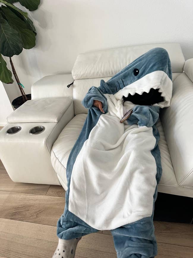 Promising review: "I absolutely love this blanket! It’s incredibly soft and comfortable — perfect for lounging around the house on chilly evenings. The flannel material is super cozy, and I love that it’s wearable, so I can just slip it on like a hoodie. The shark design is adorable, and it adds a fun touch to my downtime. It’s also the perfect size, offering just the right amount of warmth without being too bulky. Whether I’m curled up on the couch or reading in bed, this blanket has quickly become my go-to. Highly recommend for anyone looking for something fun, cozy, and unique!" —O.