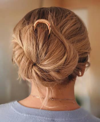 Promising review: "This Kitsch French hairpin is both beautiful and functional. The gold finish is sleek and adds a touch of elegance, whether I'm dressing up or going casual. It holds my thick hair in place all day without slipping and is much more comfortable than hair ties. Great for buns, twists, or quick updos. Super easy to use once you get the hang of it. Definitely a staple in my hair routine now!" —J. Lee Hall