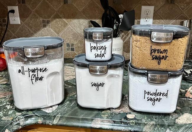 Promising review: "Sizes are all great for flour, sugar, powdered sugar, brown sugar, and sprinkles. Came with pre-made labels for the containers making marking them so much easier. The labels are generic with several that are blank for you to write on. Really pleased with the quality and how well they seal." —Ashley Ellis