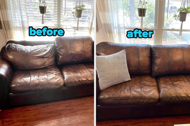Promising review: "Ok, so I had been looking into buying a new couch but I only wanted a nice leather one and they are SOOO EXPENSIVE. I decided to try and fix ours and I am SOO HAPPY with the results!! I bought two $52 boxes of poly fill (used 1 1/4 total, so I still have a lot left). I cut open each of the three sections of the inner cushions of each back cushion, re-stuffed them, and sewed them back up. It took me about a day and a half. I want to get some furniture foam to plump up the seat cushions (but that is another project and significantly more money), but the end result is a HUGE improvement! The couch looks (and feels) a million times better! Wish I had done this years ago! The first 'before' pic has a back cushion already stuffed because I didn’t think to take a pic until after I had already stuffed a cushion. If you are thinking this won’t work (like I was), you are wrong. DO IT!!!!" —Geoff