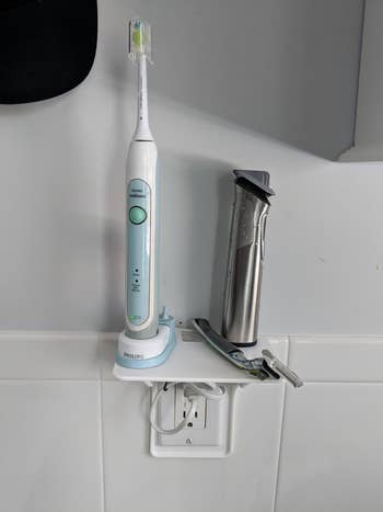 Promising review: "I absolutely love this thing! I have much less clutter on my sink thanks to this. If there's anyone not sure if it will fit due to an object, all you need is 1.25 inches of space between the edge of your existing outlet plate and the piece of furniture. I have a GFCI with a standard wall plate." —Amazon Customer