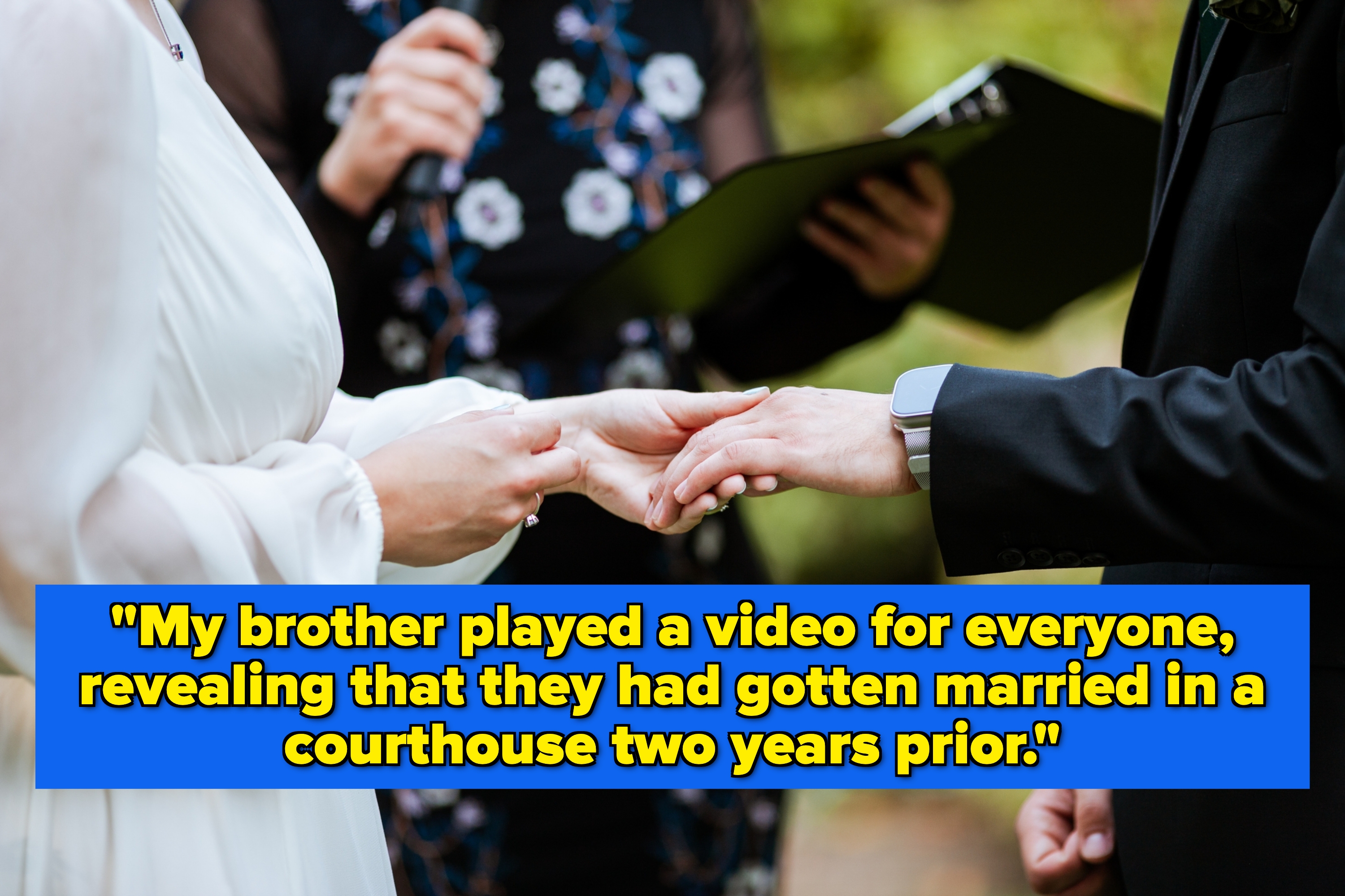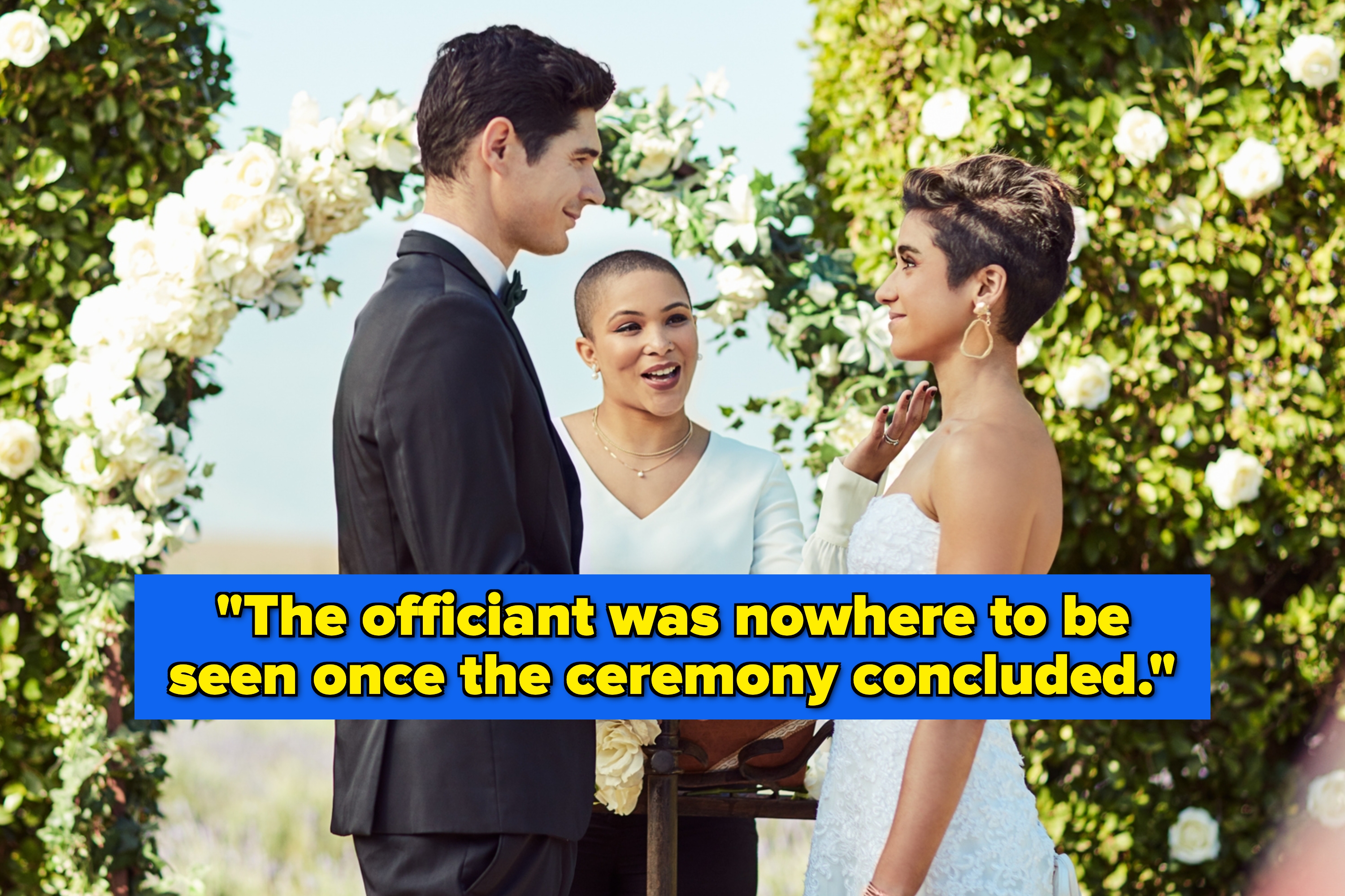 "We're an hour away from when the ceremony is supposed to begin and have no chairs, no food, no staff, no water... Nothing." I'm a New York City-based Staff Writer who enjoys covering lifestyle, relationships, and women's content. "I swear the woman ground her ass into my new FIL's crotch like she was a three-year veteran of the Vegas strip. And later that evening, she sought him out and gave him another one (albeit for very little time, because by then my dad was sticking to her like glue). Needless to say, her shenanigans did not make my new wife happy. Thankfully, her family was just as ploughed under as my own. But yeah." "Later, we get the pictures back from him, and oh lord. Each photo was heavily touched up with AI to the point of looking like an AI-generated image. The groom's face didn't even look like his anymore. The bride was pissed, and so was everyone else, to be honest. We contacted him in hopes that he had the original photos. He said he did it because the lighting was bad, but I'm not terrible at photo editing, and anything is better than AI slop. Nope, he doesn't have them. I guess he overwrote them with this AI shit. Thankfully, some guests took their own photos, so we were able to ask them for their photos to fill the wedding album. Let's just say we are never going to trust him with anything important again. Biggest regret as the MOH. Some of them are so smooth they look like paintings. No sane person would want them staining their walls or wedding albums." "The second one was a lot more batshit. My husband's family member was invited with a plus one and her daughter. She contacted my husband to say she was inviting a female friend as her plus one, and that friend also had a daughter who couldn't be left alone and didn't have a babysitter. So she asked if she could have this woman's daughter come, too. Whatever, sure. Then, her 6-year-old daughter told my husband that she really wanted to be a flower girl. We hadn't planned on having a flower girl, but she seemed so excited. So, I bought her a dress, and we got her a basket of flower petals to throw. Since I was getting ready with a few ladies (I didn't really have a wedding party; these were just friends), I invited my new flower girl and her mom to get ready with me, too. I was getting ready at an Airbnb near the venue, and my husband was getting ready with some of his friends at a different Airbnb nearby. My husband and I were coming back to the Airbnb I was getting ready at after the wedding. So, the flower girl and her mom show up, and the mom's friend and her daughter are tagging along, too. Whatever. They live three hours away, so I figure it would be hard for the friend and the friend's daughter to occupy themselves, so I just go with it. I should mention that although the flower girl and her mom live several hours away, the mom grew up in this area, and her own mom still lives here. We all get ready; I pay for everyone to get their make-up done, including this random friend and her daughter, because it felt awkward not to. The friend's daughter is dressed in a white flower girl's dress. Bizarre, but okay. As we are leaving, I realize I don't have a way to carry the Airbnb key, but the flower girl's mom says she will take it. This matters later. At the wedding, the friend's daughter has appointed herself the second flower girl. She runs up at the last minute with my flower girl and walks with her, throwing petals as they go. One of my friends comes up later and asks who the flower girls are. I tell her one is my husband's family member's daughter. We have no clue who the second one is. Anyway, at the end of the wedding, my husband and I are getting ready to go back to our Airbnb, and I mention that the flower girl's mom has the key to our place. He goes to retrieve it and comes back looking confused. He says, 'She says she's coming back with us.' Um, what? She told my husband that 'the plan' was that she, her friend, and their daughters were coming back to our Airbnb to spend our wedding night with us! I paused for about five seconds before I said, 'Absolutely not!' And my husband got his senses about him enough to realize this was fucking unbelievable and went to tell her that she was not spending our wedding night with us. She cried, said we were throwing her and her daughter out on the street. He told her to stay at her mom's, and she said she couldn't because her mom wasn't expecting her (neither were we!). My husband offered to pay for a hotel room for them, but then she said a single hotel room wasn't enough for all four of them (but apparently our Airbnb was enough for six of us). So, my husband paid for two hotel rooms for them. She started calling my husband repeatedly, beginning at 7 a.m. the day after our wedding, we think, because she wanted to stay at the hotel longer. We ignored her and haven't taken her calls since. We also found out afterwards that she stole a wedding card from the reception. We are pretty easy-going people, but this really tested our limits. We have ended any relationship with her. It was just too much." "Fast forward to the reception. About an hour into that, my brother played a video for everyone, revealing that they had gotten married in a courthouse two years prior. For some strange reason, they never told anyone. We were all just finding out. They didn't have a good reason why. They just said, 'We woke up that day and decided to get married.' People were incredibly confused. Older people in the room were asking people what was going on. It all happened so fast. Later, my brother's wife asked my parents what they thought of the 'wedding,' and they both said, 'Well, it was really nice...but we would have liked to know it wasn't a real wedding beforehand.' The bride FREAKED and basically threw a tantrum right there in front of everyone. Stuff got ugly. My brother yelled at them, calling them the ones who ruined the whole evening. A lot of people frankly left after the big r