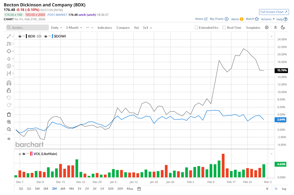 Valued at a market cap of $50.3 billion, Becton, Dickinson and Company (BDX) is a global medical technology leader based in Franklin Lakes, New Jersey. It develops, manufactures, and sells a comprehensive range of medical supplies, devices, and interventional solutions. Companies valued at $10 billion or more are typically classified as “large-cap stocks,” and BDX fits the label perfectly, with its market cap exceeding this threshold, underscoring its size, influence, and dominance within the medical instruments & supplies industry. By prioritizing innovation in high-growth fields such as biologic drug delivery, automated medication management, and advanced patient monitoring, the company continues to advance the world of health by improving clinical outcomes and operational efficiency for providers and patients. Citi Analysts Like This 1 ‘Picks-and-Shovels’ AI Stock. Should You Buy It Here? Nvidia Stock May Be Oversold - What is the Best NVDA Play? Analysts Think Okta Stock Can Gain 100% in 2026. Should You Buy the Dip? Our exclusive Barchart Brief newsletter is your FREE midday guide to what's moving stocks, sectors, and investor sentiment - delivered right when you need the info most. Subscribe today! This healthcare giant is currently trading 5.8% below its 52-week high of $187.35, reached on Feb. 24. Shares of BDX have rallied 15.8% over the past three months, considerably outperforming the Dow Jones Industrial Average’s ($DOWI) 3.3% rise during the same time frame. Moreover, on a YTD basis, shares of BDX are up 15.7%, compared to DOWI’s 1.9% rise. However, over the past 52 weeks, BDX has gained marginally, lagging behind DOWI’s 13.3% uptick. To confirm its bullish trend, BDX has been trading above its 200-day moving average since late November, with slight fluctuations, and has remained above its 50-day moving average since mid-November. On Feb. 9, shares of BDX plunged 1.3% despite reporting better-than-expected Q4 results. The company’s revenue increased 1.6% year-over-year to $5.3 billion, surpassing consensus estimates. However, its management remains cautious about persistent macroeconomic and regulatory headwinds, especially from China and vaccine demand, which might have made investors jittery. Additionally, its adjusted EPS of $2.91 handily topped analyst expectations of $2.82. BDX has notably outperformed its rival, Intuitive Surgical, Inc. (ISRG), which declined 10.7% over the past 52 weeks and 11.1% on a YTD basis. Given BDX’s recent outperformance, analysts remain moderately optimistic about its prospects. The stock has a consensus rating of "Moderate Buy” from the 14 analysts covering it, and the mean price target of $194.08 suggests a 10% premium to its current price levels. On the date of publication, Neharika Jain did not have (either directly or indirectly) positions in any of the securities mentioned in this article. All information and data in this article is solely for informational purposes. This article was originally published on Barchart.com