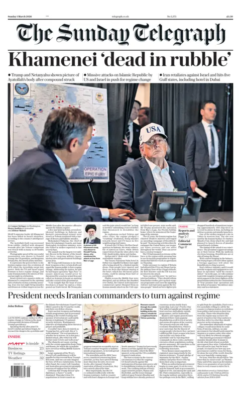 The front pages carry images of fiery explosions as - according to the Sunday Express - "chaos erupted" across the Middle East. The world is holding its breath, the paper says, after what it describes as "devastation" in the region. "Middle East in flames" is the headline in the Sunday Mirror, while the Sun on Sunday opts for simply: "Ayatollah dead". It says that following a "missile blitz" by the US and Israel the Iranian leader's body was found in rubble at his palace in Tehran. According to the Sunday Telegraph, Ayatollah Ali Khamenei's death "represents the gravest blow to the Iranian regime" since the 1979 Islamic Revolution. In comments highlighted by the Sunday Times, US President Donald Trump says it marks "the single greatest chance" for the regime to be overthrown, urging the Iranian people to "take back their country". One student in the city of Isfahan tells the paper that the government is more afraid of protesters than the US or Israel. But the Observer describes the strikes as "a war begun with no plan for peace" by a "dangerously reckless" president. Politico suggests the killing of the Ayatollah leaves a "power vacuum" which "plunges Iran's future into uncertainty". The website says that the armed forces "could use the opportunity to take more power", which would mean Iranians "could continue to face repression". The London-based Iran International โ which the regime has classed as a terrorist organisation โ says the strikes have intensified "disarray and confusion" within the country's military. Sources tell the outlet that the Revolutionary Guard Corps is insisting on the "swift appointment" of the next supreme leader, outside the normal procedures. As for Trump's view of Iran's future, he has spoken to the American news website, Axios - comments it says "offer the first real window into his thinking about how this ends". He tells the outlet that he can "go long and take over the whole thing, or end it in two or three days", and tell the Iranians that if they rebuild their nuclear programme he will "see them in a few years". He also says that one of his reasons for launching Operation Epic Fury was his belief that Tehran "didn't really want" to agree a deal over the programme. The Telegraph, however, speculates that Trump may have had another motive for the strikes - saying their timing is "no coincidence". It reports that at a time when his approval ratings are at their lowest he "hopes a decisive blow against a foreign aggressor will allow the Republicans to cling to power" in the forthcoming midterms. The Times points out that he "came into power promising to end US entanglement in forever wars". It describes the strikes as his "most daring act yet", but adds that "they must succeed". Sign up for our morning newsletter and get BBC News in your inbox.