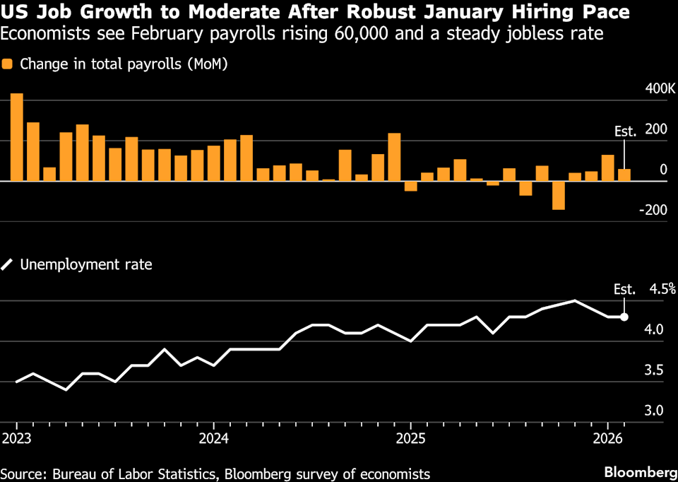 (Bloomberg) — US payrolls growth probably settled back in February after the strongest month of hiring in a year, returning to a more moderate and likely sustainable pace of hiring. Economists project 60,000 jobs were added for the month — less than half the number created at the start of the year, according the median of a Bloomberg survey ahead of Friday’s report. The jobless rate is seen holding steady at 4.3%. Most Read from Bloomberg Minneapolis Braces for Rent Crisis As ICE Surge Winds Down It’s a Tough Time To Be a Black Real Estate Developer New Tax Proposal Takes Aim at Thailand’s Salty Food Obsession Oslo Rebuilds Its Government Quarter with a New Focus: Openness Alberta’s Deficit To More Than Double, Hit by Oil Price Drop After years of scrambling to lure workers, employers dialed back hiring rapidly in 2025. The result was the weakest year for payrolls growth outside of a recession since 2003. That’s led to increased anxiety among American consumers who’ve been the primary source of fuel for the economy. The longer the job market limps along, the more consumer resilience will be put to the test. January retail sales data, due on the same day as the payrolls report, are unlikely to offer concrete signals either way because severe winter weather snarled activity across much of the US. Economists forecast a modest increase in receipts at US retailers other than auto dealers and gas stations. Fuel prices fell to a five-year low earlier in the month before rebounding in the closing weeks of January. Auto sales slumped, based on industry figures, also likely due to weather. “We expect a 30K drop in February payrolls, a sharp deceleration from January’s surprisingly strong print. The slowdown is more reflective of the cold spell in late-January and early February than a weakening in underlying hiring conditions. Weather-sensitive sectors were particularly hard hit, including construction and leisure and hospitality likely. But our broader takeaway is that labor market conditions have stabilized since last fall.” —Anna Wong, Stuart Paul, Eliza Winger, Chris G. Collins, Alex Tanzi and Troy Durie, economists. In addition to the jobs and retail sales reports, economists will parse a pair of surveys on manufacturing and services for clues about business sentiment. The Institute for Supply Management will issue its manufacturing index on Monday, followed by the group’s gauge of services activity on Wednesday. The Federal Reserve on Wednesday will release its Beige Book, offering anecdotal insight into economic conditions around the country. In Canada, officials will survey the outlook in a more shock-prone world, with Bank of Canada Governor Tiff Macklem discussing economic and financial stability risks and Deputy Governor Sharon Kozicki outlining how the monetary policy framework may need to adapt. Markets will also parse productivity data for signs that a rebound carried into year-end. Prime Minister Mark Carney is traveling to India, Australia and Japan, advancing efforts to diversify trade relationships. Elsewhere, a plethora of inflation numbers — from the euro zone to Turkey, and from South Korea to Chile — as well as multiple activity indexes and China’s National People’s Congress will be among the highlights. Fallout from joint US-Israeli strikes on Iran also will be in focus. The week kicked off with export data for South Korea, which showed an acceleration in February, reinforcing the central bank’s view that solid semiconductor demand is helping cushion the economy as it maintains a neutral policy stance. Australia releases data Wednesday that’s expected to show that growth picked up a tad in the fourth quarter, in figures likely to sustain speculation over another Reserve Bank of Australia rate hike this year after January inflation held above the bank’s target. China gets PMI statistics the same day that will probably highlight the need for more policy support after a sluggish start to the year. Meanwhile, the National People’s Congress that starts on Thursday will set the tone for the economy in the year ahead. Official manufacturing and non-manufacturing gauges for February are both forecast to stay contractionary. The RatingDog indexes also due have tended to be a little more upbeat. Other Asian nations releasing PMI statistics in the coming week include Indonesia, Malaysia, the Philippines, Thailand, Singapore, South Korea, Taiwan and Vietnam. Japan’s Ministry of Finance on Tuesday releases a report card for corporations. Fourth-quarter profits will give an indication of whether firms have scope to maintain robust wage growth, and capex data will be watched closely after preliminary GDP for the period showed anemic 0.2% growth in business spending. Tuesday’s figures will be factored into revised GDP due March 9. South Korea’s consumer inflation is seen picking up a bit in February, to 2.2%, likely keeping the Bank of Korea in a holding pattern for now. Indonesia’s February consumer inflation is expected to accelerate to 4.34% after recording the fastest clip since 2023 a month earlier, in data that could test Bank Indonesia’s resolve to stay accommodative. Also releasing CPI figures are Thailand, the Philippines and Vietnam. Trade data are due from Vietnam, Australia, Indonesia and Pakistan. In central bank action, three RBA officials are due to speak, possibly offering clues on the timing of the next rate hike, with pricing in the overnight-indexed swaps market implying only the sliver of a chance of a back-to-back increase at the next decision on March 17. Assistant Governor Sarah Hunter speaks at the Norges Bank Conference in Oslo on Monday. The following day, Governor Michele Bullock delivers a speech at the AFR Business Summit in Sydney, and Deputy Governor Andrew Hauser speaks on a panel in New York at the end of the week. Elsewhere, Malaysia’s central bank is forecast to hold its overnight policy rate steady at 