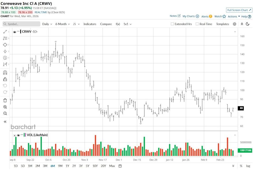 CoreWeave (CRWV) shares charged higher on Wednesday as the “AI Neocloud” specialist secured a major deal with one of the industry’s fastest-growing search disruptors — Perplexity AI. This multi-year strategic partnership will see Perplexity utilize CRWV’s dedicated GB200 NVL72 clusters to scale its Sonar and Search API ecosystem. In return, the Livingston-headquartered firm will integrate Perplexity’s Enterprise Max across its operations. Despite today’s gains, CoreWeave stock remains down more than 25% versus its year-to-date high. Investors Are Bullish on Alphabet Stock - Piling Into GOOGL Call Options With Huge Unusual Options Volume Stock Index Futures Higher as Investors Digest U.S. ADP Jobs Report This Oil Stock Just Soared 130%. Should You Chase Battalion Oil Here? Tired of missing midday reversals? The FREE Barchart Brief newsletter keeps you in the know. Sign up now! The Perplexity news is constructive, as it shifts the narrative for CRWV stock from capital-intensive buildouts to high-margin execution. Perplexity currently answers more than 1.5 billion questions monthly, and by choosing CoreWeave over traditional hyperscalers, the startup is validating the superior latency and reliability of its purpose-built AI infrastructure for real-world production. Investors cheered the announcement as it focuses particularly on AI inference, which many believe will eventually become a larger market than model training. By securing a flagship inference customer, CoreWeave is “diversifying” its revenue stream beyond experimental labs and into daily consumer application, opening the door for further gains in 2026. Long-term investors should consider investing in CRWV for the strength of its revenue backlog as well. In late February, the company reported a remarkable $67 billion backlog. Meanwhile, its recent $5 billion agreement with Meta Platforms (META) further solidifies its role as a primary provider of the Nvidia (NVDA) GB300-powered infrastructure. With a 3.1-gigawatt power pipeline, and a clear path to $30 billion in annual recurring revenue (ARR), CoreWeave is strongly positioned for long-term dominance in GPU-as-a-Service. This is why options pricing currently signals a rally in CoreWeave shares to north of $100 by mid-May, which means the AI stock could gain nearly 30% within the next three months. Wall Street analysts also remain bullish on CRWV shares, especially after management guided for a 140% year-on-year increase in revenue to more than $12 billion this year. The consensus rating on CoreWeave sits at “Moderate Buy” currently, with the mean target of $120 indicating potential upside of roughly 50% from here. On the date of publication, Wajeeh Khan did not have (either directly or indirectly) positions in any of the securities mentioned in this article. All information and data in this article is solely for informational purposes. This article was originally published on Barchart.com