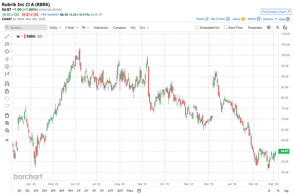 Cybersecurity spending continues to surge despite shifting dynamics in the artificial intelligence (AI) landscape, and Rubrik (RBRK) is emerging as a standout name in the space. Recent channel checks from Wedbush Securities suggest the company is receiving some of the strongest vendor feedback as enterprises deepen investments in cyber resilience and data protection. Analysts led by Dan Ives highlighted that enterprise IT budgets are expanding meaningfully, supported by rising allocations for AI. Enterprise budgets rose about 20% at the start of the year, with AI spending increasing another 20%, producing roughly a 33% overall rise in technology and AI-related spending across organizations. Dear Raytheon Stock Fans, Mark Your Calendars for March 6 Stocks Slip Before the Open as Bond Yields Climb on Inflation Worries, U.S. Economic Data on Tap Peter Thiel Is Dumping Palantir Stock. Should You? Stop Missing Market Moves: Get the FREE Barchart Brief – your midday dose of stock movers, trending sectors, and actionable trade ideas, delivered right to your inbox. Sign Up Now! Deal dynamics are also shifting across the cybersecurity sector. Around 80% of deals in the current pipelines are being revised upward. Competition and disruption also remain part of the landscape. New cyber-AI tools from Anthropic and innovations such as Claude Cowork are influencing the market. Notably, sales cycles have stretched to about 109 days as buyers demand more proof-of-concept testing. Yet despite longer negotiations, analysts report no deals being lost, with Rubrik among vendors receiving particularly solid demand signals. Against this evolving backdrop, let’s delve deeper to better understand what stance investors might consider taking on the stock. Based in Palo Alto, California, Rubrik provides data security and cyber-resilience solutions to enterprises worldwide. Its platform safeguards enterprise, cloud, SaaS, and unstructured data while offering threat analytics, security posture management, and cyber-recovery capabilities for organizations across various industries. Valued at roughly $11 billion, the company operates in a rapidly expanding cybersecurity market but has faced notable stock volatility recently. Over the past 52 weeks, Rubrik’s shares have declined 10.8%. The weakness has intensified in 2026, with the stock down 26.7% year-to-date (YTD) and falling 35% over the past three months. From a valuation standpoint, the stock still trades at a premium relative to many cybersecurity peers. Shares are currently priced at about 8.57 times sales, reflecting investor expectations tied to the company’s growth potential and expanding role in AI-driven cybersecurity solutions. Rubrik delivered a solid operational update when it unveiled its Q3 fiscal year 2026 results on Dec. 4, 2025, highlighting improving profitability and steady demand for its data-security platform. Total revenue rose 48.3% year-over-year (YOY) to $350.2 million, surpassing analyst expectations by 9.11%. The company posted non-GAAP net income of $22.9 million, marking a turnaround from a non-GAAP net loss of $37.8 million in the prior-year period. Meanwhile, non-GAAP earnings per share came in at $0.10, a notable improvement from a non-GAAP loss of $0.21 per share reported in the same period last year. The quarter also reflected strong operational momentum, with subscription annual recurring revenue (ARR) rising 34% YOY and free cash flow exceeding $76 million. Encouraged by the results, management has raised its outlook for fiscal 2026. For the full fiscal year, Rubrik expects subscription ARR between $1.439 billion and $1.443 billion, with revenue projected in the range of $1.280 billion to $1.282 billion. Additionally, the company anticipates a non-GAAP net loss per share of $0.20 to $0.16 for the year. For the fiscal fourth quarter of 2026, management forecasts revenue between $341 million and $343 million, alongside a non-GAAP subscription ARR contribution margin of about 9%. The company expects the non-GAAP net loss per share to range from $0.12 to $0.10 for the quarter. Rubrik is scheduled to report its fiscal Q4 2026 results after the market closes on Thursday, March 12. Analysts expect the quarterly loss per share to narrow 13.1% YOY to $0.53. For the full fiscal year 2026, the company’s loss per share is projected to shrink 75.5% to $1.83, with another 10.4% improvement anticipated in the following fiscal year to $1.64. Rubrik currently holds a “Strong Buy” consensus rating on Wall Street, reflecting positive sentiment around the company’s long-term growth prospects. Of the 25 analysts covering the stock, 23 recommend a “Strong Buy,” while two maintain a “Hold.” Based on current projections, the average price target of $102.09 implies potential upside of 82.7%. Meanwhile, the Street-high target of $130 suggests the shares could rally as much as 132.6% from current levels. On the date of publication, Aanchal Sugandh did not have (either directly or indirectly) positions in any of the securities mentioned in this article. All information and data in this article is solely for informational purposes. This article was originally published on Barchart.com