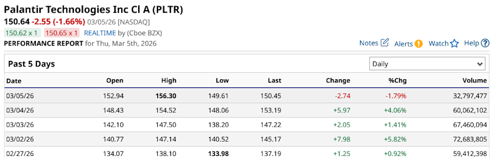 Palantir (PLTR) is among the favorite stocks for investors to trade right now, and there are good reasons for such a view. With volatility comes the opportunity for traders to make money, and the daily price swings in PLTR stock have certainly been notable of late. Indeed, the company's price action in recent days has been significant, with all but two days sending shares of this leading AI and computing infrastructure stock more than 1% higher. That's some strong recent price momentum, and these recent moves signal a reversal of prior negative sentiment among AI-related names as it pertains to the spending and long-term growth outlook of this sector overall. Investors Are Bullish on Alphabet Stock - Piling Into GOOGL Call Options With Huge Unusual Options Volume This Oil Stock Just Soared 130%. Should You Chase Battalion Oil Here? Stock Index Futures Higher as Investors Digest U.S. ADP Jobs Report Tired of missing midday reversals? The FREE Barchart Brief newsletter keeps you in the know. Sign up now! That said, let's dive into whether Palantir (which is still down more than 25% from its recent peak and 15% on a year-to-date basis) is worth buying and what fundamental driver could take this stock to fresh all-time highs this year. Overall, the story with Palantir remains one that centers on growth expectations. I say that because, looking at the underlying fundamentals shown below, it's clear that there's plenty of future growth that's baked into the company's valuation. The rule of thumb put forward by a number of iconic investors is that companies trading above a price-earnings-to-growth ratio of 1.0 are expensive. At a ratio of nearly 3 on this front, with a forward price-earnings ratio at 140 times, Palantir is undoubtedly one of the most expensive large-cap tech stocks in the market. Personally, I think looking at a company's PEG ratio is more viable for companies in such a camp, as it adjusts this multiple for a given company's growth rate, which is really what every investor should be doing. Now, it could certainly be the case that continued strength in AI-adjacent stocks will drive higher-than-expected revenue and earnings growth down the road, in which case this is a stock that could look very cheap in a few years' time. I think the jury is still out on that front, with continued concerns around current spending levels on AI applications and adoption creating some pause in the market from investors. That said, it's also true that any significant pullback in PLTR stock is one that seems to be met with significant buying pressure, at least in the recent past. And the aforementioned near-term price action we've seen in this stock over the past week could be indicative of another risk-on rally taking hold. With sentiment improving in the market broadly following a number of significant geopolitical moves from the Trump administration, really anything is possible right now. With that in mind, let's defer to what the experts think of Palantir right now. The current consensus price target on PLTR stock, at least according to experts on Wall Street, is just slightly above $200 per share. Thus, those who follow this company the closest are pricing in around 33% upside from current levels, with a high price target of $260 per share indicating this stock could have near-double-up potential from here. Now, such a move would not necessarily be out of the ordinary for this stock, which has seen absolutely incredible momentum on the way up for most AI-related stocks. That said, I do think the ride from here will be a bit bumpier than it was in 2023-2024, when Palantir really became one of the favorite “meme stocks” of sorts, at least for traders looking to capture upside from near-term bullish price momentum. PLTR will continue to be a stock I follow closely, and I will update investors accordingly with any major news ahead. On the date of publication, Chris MacDonald did not have (either directly or indirectly) positions in any of the securities mentioned in this article. All information and data in this article is solely for informational purposes. This article was originally published on Barchart.com