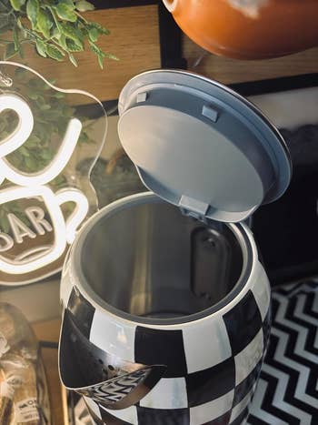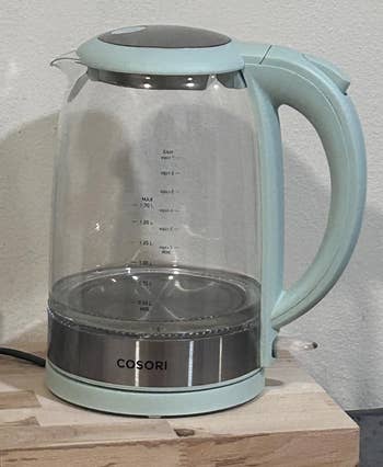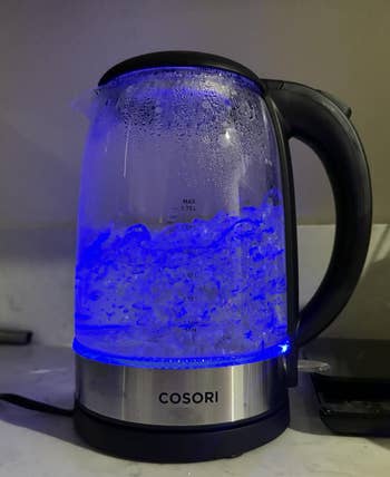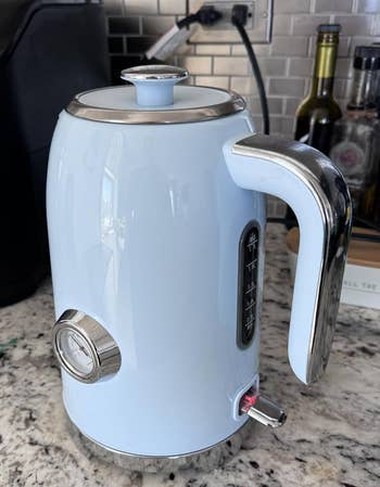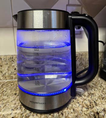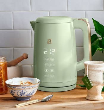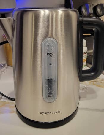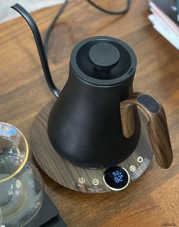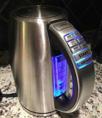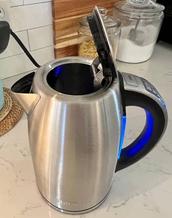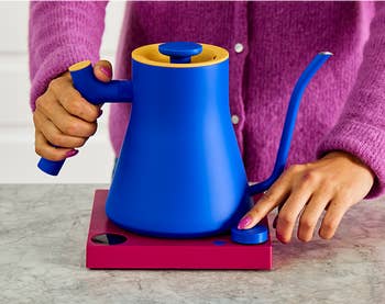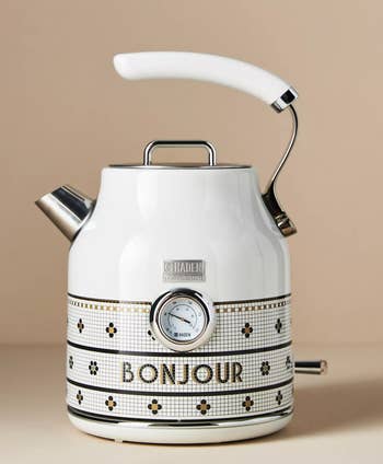 We hope you love our recommendations! While every product is independently chosen by our editors, BuzzFeed and our publishing partners may collect a share of sales or other compensation from the links on this page. You can read more about how our affiliate partnerships work in our Editorial Standards & Ethics Guide. "I have used it every single morning and sometimes in the evening for eight years, and it still works like the day I purchased it." Yeah, I'm sold. I'm going to hold your hand when I say this, but it's 2026, and there's no reason you should still be heating water on the stove and waiting 10 minutes for a single bubble to form. If you've never experienced the wonders of an electric kettle, they're not only helpful with cutting down the time between you and your morning brew or evening tea, but they're also *super* useful for speeding up cooking, too (think: noodles, oatmeal, soup)! Whether you're just starting your kettle journey or are in need of an upgrade, we've gathered the best options to help you find the one that's right for you — from small and sleek like the Bodum bistro kettle, extra-large like the Stariver, and the most jaw-dropping stunner of a collab between Great Jones and Fellow (hint: it's so gorgeous, and so blue). Just be prepared... because once you introduce an electric kettle into your home, you won't be able to imagine life without it. A charming Bistro Tile x Haden electric kettle that'll see your old crusty dusty kettle (hey, it's trying its best) and be like "excusez-moi." 💅✨ It comes with a standard on/off design and safety features, but the vintage-style thermostat gauge and British silhouette will make every morning feel like you're living your "escape the city and live in a gorgeous cottage" fantasy. It even has 24k gold decals — so fancy! Promising reviews: "I’m loving this kettle! It heats quickly and looks amazing. I use it for tea every night." —Chic Traveler "Cute design, I love it so much. The handle gets warm, so I recommend using a mitt. Other than that, it's adorable" —galjarah Get it from Anthropologie for $128 (available in black/white and pink; other colors available on Amazon). Btw, Anthropologie has an entire Bistro Tile collection! Beautiful electric kettle by Drew Barrymore, which I would honestly think is kind of a silly name for a brand if it weren't so dang... beautiful. It's kept sleek with zero buttons or dials — instead, it has a touch-activated display right on the side (which doesn't get hot thanks to the double-walled stainless steel) where you can pick from four pre-set heat options or choose your own. It also has safety features and a 30-minute keep-warm setting, but more importantly, comes in lots of super pretty colors you don't normally see in kettles at this price point! Thanks, Ms. Barrymore! Promising review: "I LOVE the size — not too big or small for avid tea drinkers like myself and hubby. It keeps the water warm between cups and turns itself off after about 20 minutes. Also has different temps for different types of teas which is an added bonus. I bought this in sage green, and it looks BEAUTIFUL on my counter :)" —Carla Get it from Walmart for $47.88 (available in eight colors). An Amazon Basics electric kettle if you don't need the bells and whistles of temp control or fancy spouts, just a reliable way to get your water bubbling, stat. It doesn't skimp out on safety features, though! It has automatic shut-off, boil-dry protection, *and* a cool-touch handle. It'll also have your water boiling in about three to five minutes, so if you're still on the fence about whether an electric kettle will truly change your life (it will), that speed alone will up your kitchen game. Capacity: 1 liter (4 cups), 1.7 liters (7 cups) Promising review: "This kettle is — dare I say it — life changing! For my family of six, I purchased the large glass carafe model. We have had this kettle for a year now and it’s still going strong even with daily use. Several times each day, typically. I love the auto shutoff; the ‘click’ that sounds is audible enough to alert you that the kettle has finished boiling. I appreciate the blue light that illuminates the kettle so the kids know it’s hot/heating. The release button for the lid is easy to push, great for my arthritis. The handle is comfortable and balanced, easy for both myself and my four kids ages 15, 14, 11, and 10 to lift off the base and pour. Water tastes and smells clean, even though we use tap water, which in our area is a bit hard. We rinse the scale out of the kettle regularly and occasionally give it a gentle scrub with a vinegar and water solution to get rid of any stubborn scale. Cleans up easily. The kettle boils really fast; I would estimate within three to five minutes. It’s great to have hot water nearly ‘on demand’ for cooking. I use it to quickly heat water for pasta, vegetables, and steaming. [My kiddos] even have ‘hacked’ an easy way to make those cheap ramen soup packets. We love this kettle and can’t imagine living without one now. I don’t know what we were doing before. The time savings and convenience are well worth the affordable price. Get this kettle! You’ll be happy you did." —Natalie Marx Get it from Amazon for $23.60+ (available in two sizes and in a stainless steel or glass design). MacKenzie-Childs checkered electric kettle that might just become the reason you're excited to wake up at 6 a.m. to make your morning cup. Okay, maybe not, but you need as many endorphins as you can get, and this beauty delivers! It's got a stainless steel design, safety features, a keep-warm setting for 30 minutes, *and* you can choose your desired temp before boiling. Oh yeah, and each piece is hand-painted, so it's *literally* a work of art. Promising review: "Used for the first time this evening to boil water for hot chocolate. Worked as it should! Very quick to heat up. The style and quality is perfect, well made, looks ama