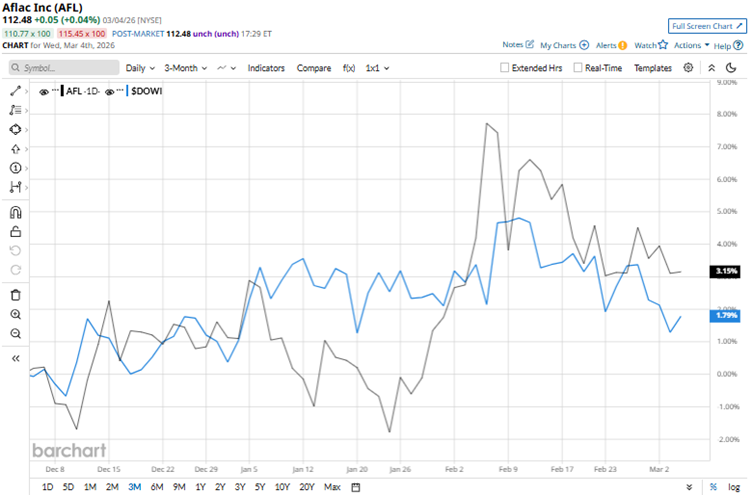 Aflac Incorporated (AFL) is an insurance company that provides supplemental financial‑protection products to individuals and groups, mainly in the U.S. and Japan. Its operations focus on helping people cover costs when major medical or life‑insurance benefits fall short. The company’s headquarters are in Columbus, Georgia. It has a market capitalization of $58.06 billion, making it a “large-cap” stock. Aflac’s shares reached a 52-week high of $119.32 on Feb. 5, but are down 5.7% from that level. The market reflects Aflac’s slow but steady growth profile, as evidenced by its modest stock price gains. Over the past three months, the stock has gained 3%. Contrarily, the broader Dow Jones Industrial Average ($DOWI) is up 1.9% over the same period. Therefore, the stock has outperformed the wider index over this period. Investors Are Bullish on Alphabet Stock - Piling Into GOOGL Call Options With Huge Unusual Options Volume This Oil Stock Just Soared 130%. Should You Chase Battalion Oil Here? Stock Index Futures Higher as Investors Digest U.S. ADP Jobs Report Tired of missing midday reversals? The FREE Barchart Brief newsletter keeps you in the know. Sign up now! However, this outperformance has not been seen over the past year. Over the past 52 weeks, the stock has increased 4.5%, while the Dow Jones index is up 14.6%. Aflac’s shares have increased 2% year-to-date (YTD), while the index has gained 1.4%. Aflac’s stock has been trading above its 50-day moving average since late January, but has recently been hovering near it. The stock has also been trading above its 200-day moving average since late October. Aflac reported its fourth-quarter results for fiscal 2025 on Feb. 4. The company’s quarterly revenue declined by 9.9% year-over-year (YOY) to $4.87 billion. However, this was higher than Street analysts' expectations, leading the stock to gain 3.4% intraday on Feb. 5. For 2026, the company remains focused on third-sector products in the Aflac Japan segment to appeal to younger customers seeking integrated financial protection and services across the different stages of their lives. In the U.S. segment, the company is focused on profitable growth through strong underwriting discipline and improved productivity of agents and brokers. We compare Aflac’s performance with that of another life insurance stock, MetLife, Inc. (MET), which has dropped 10.1% over the past 52 weeks and 7.1% YTD. Therefore, Aflac has been the clear outperformer over these periods. Wall Street analysts are tepid on Aflac’s stock. The stock has a consensus rating of “Hold” from the 15 analysts covering it. The mean price target of $112.38 is approximately flat from current levels. However, the Street-high price target of $130 indicates a 15.6% upside. On the date of publication, Anushka Dutta did not have (either directly or indirectly) positions in any of the securities mentioned in this article. All information and data in this article is solely for informational purposes. This article was originally published on Barchart.com