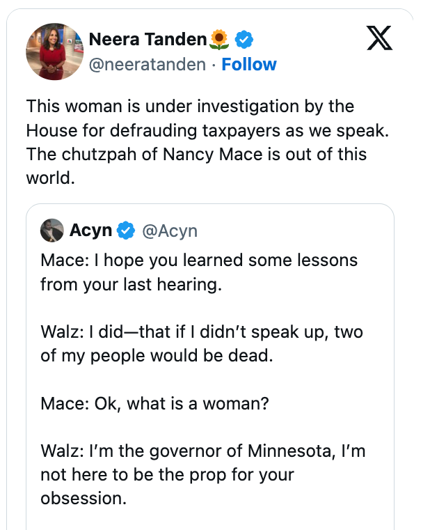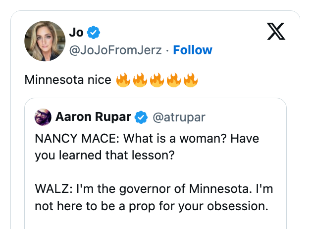"walz just refused to play the game and it completely disarmed the entire exchange." I'm an LA-based trending news writer covering health, politics, and internet culture. "I want you to say that a woman like me is an adult human female. That men can't become women," she responded back in June. She continued, "You guys are the party of violence, and you're the party erasing women. You don't respect us. You're a bigot. You're a misogynist. You're a sexist. Mr. Chairman, I yield back." NANCY MACE: What is a woman? Have you learned that lesson?WALZ: I'm the governor of Minnesota. I'm not here to be a prop for your obsession. pic.twitter.com/5XSYcjZijG