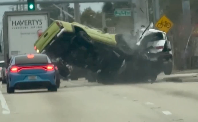 Things ended badly on a street in Melbourne, Florida, on Feb. 28, when a driver failed to brake and crashed at speed into a car stopped in traffic. Beauregarde McDonald told Storyful that he decided to pull out his phone and start recording after the green Tacoma seen in his video “pulled out almost hitting me and then proceeded to drive like a maniac.” “I had a feeling something was going to happen but I didn’t know it would be this,” McDonald said. The dramatic footage shows the green pickup overtaking McDonald and rapidly catching up with vehicles stopped a little farther ahead. The driver “was accelerating the entire time until a last-second brake attempt,” McDonald said, with the video capturing the powerful impact which sent the truck flying. McDonald said that the white car was “pretty beat up” and that its driver and passenger were in “an absolute state of shock and in rough condition.” This article originally appeared on Storyful: Video shows truck slam at speed into Melbourne, Florida traffic