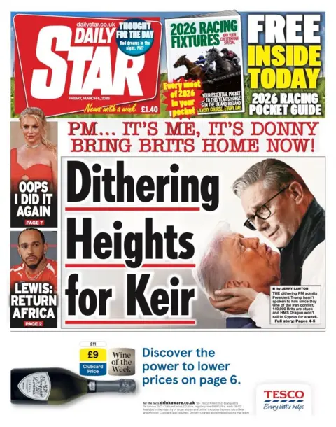 The Daily Telegraph leads on Sir Keir Starmer telling Donald Trump to negotiate with Iran and de-escalate the war in the Middle East. The paper says the comments threaten to strain an "increasingly fraught" relationship between the UK and the US. It also tells its readers that tensions related to the conflict "spilt on to the streets of Manchester" as demonstrators gathered to mourn the death of Ayatollah Khamenei and clashed with counter-protesters. The Times focuses on Trump's insistence that he must help choose Iran's next leader. He called the frontrunner Mojtaba Khamanei - the son of the assassinated Supreme Leader - a "lightweight" who, if selected, would draw the US into another conflict with Iran within five years. The headline on the Daily Mail is "desperate and delusional" as the paper details the opinions of opposition politicians about Sir Keir Starmer's response to the war. The Daily Star accuses the Prime Minister of "dithering" and tells him to "get a grip" - while the Daily Express says Britain needs a warrior, not a wobbler. The Daily Mirror says Sir Keir has vowed to do all he can to protect Britons in the Middle East. The Financial Times says the drone attack on Azerbaijan which closed parts of its airspace means air travel between Europe and Asia has been squeezed into a "narrow corridor" about 50 miles across. Iran has been blamed for the attack and the paper says it has put further pressure on western airlines avoiding the Middle East and Russia. The Sun claims the Soham child killer, Ian Huntley, was blinded when he was attacked with a makeshift weapon in prison last week. The newspaper quotes a source saying that he is "near the end" - and that very few people will shed a tear. According to the Guardian, the Home Secretary, Shabana Mahmood, has put herself on a "collision course" with Labour MPs over her immigration reforms. One backbencher is reported as saying the changes "mimicked Donald Trump" with another claiming they would lead to another Windrush-style scandal. The paper says Mahmood was "confident" she would be able to enact the changes. Sign up for our morning newsletter and get BBC News in your inbox.