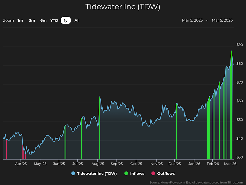 TDW owns and operates offshore support ships for offshore energy exploration, production, and wind activities around the world. The company’s fourth-quarter fiscal 2025 report showed nearly $600 million in EBITDA, $430 million in free cash flow, quarterly revenue of $336.8 million, and GAAP per-share earnings of $4.41, which exceeded expectations. No wonder TDW shares are up 59% this year – and they could rise more. MoneyFlows data shows how Big Money investors are again betting heavily on the stock. Institutional volumes reveal plenty. In the last year, TDW has enjoyed strong investor demand, which we believe to be institutional support. Each green bar signals unusually large volumes in TDW shares. They reflect our proprietary inflow signal, pushing the stock higher: Plenty of energy names are under accumulation right now. But there’s a powerful fundamental story happening with Tidewater. Institutional support and a healthy fundamental backdrop make this company worth investigating. As you can see, TDW has had strong sales and earnings growth: 3-year sales growth rate (+29.9%) 3-year EPS growth rate (+88.5%) Source: FactSet Also, EPS is estimated to ramp higher this year by +49.7%. Now it makes sense why the stock has been generating Big Money interest. TDW has a track record of strong financial performance. Marrying great fundamentals with MoneyFlows software has found some big winning stocks over the long term. Tidewater has been a top-rated stock at MoneyFlows. That means the stock has unusual buy pressure and growing fundamentals. We have a ranking process that showcases stocks like this on a weekly basis. It made the rare Outlier 20 inflow report six times recently, gaining 26.6% since late January’s outlier inflow. The blue bars below show when TDW was a top pick in the last year…boosted by Big Money: Tracking unusual volumes reveals the power of money flows. This is a trait that most outlier stocks exhibit…the best of the best. Big Money demand drives stocks upward. The TDW action isn’t new at all. Big Money buying in the shares is signaling to take notice. Given the historical gains in share price and strong fundamentals, this stock could be worth a spot in a diversified portfolio. Disclosure: the author holds no position in TDW at the time of publication. If you are a Registered Investment Advisor (RIA) or are a serious investor, take your investing to the next level and follow our free weekly MoneyFlows insights. This article was originally posted on FX Empire Huge Technology Rotation is an Opportunity See How Royal Caribbean Rises on Institutional Inflows Semiconductor Opportunity Is Here Further Strength for the Australian Dollar After Higher Inflation Gold Analysis: $6,000 in Sight, $8,250 as the Macro Crisis Target See Tidewater Rise as Big Money Buys