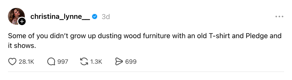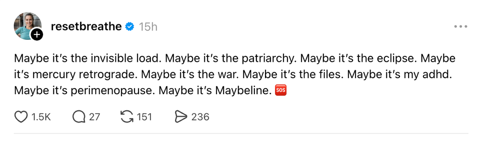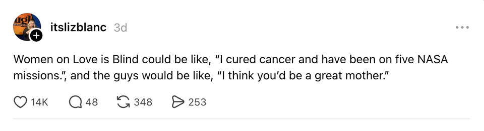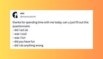 The ladies of the internet never fail to brighten our day with their brilliant and succinct wit. Each week, HuffPost Women rounds up their hilarious musings. Scroll through this week’s great tweets, threads and other posts from women, and then visit our “Funniest Tweets From Women” page for past roundups. Sign up for our Funniest Tweets of the Week newsletter here. my bf is beefing with the 6 year old i babysit bc he has a crush on me. he’s asking me things like “are you with him right now?” yeah and we’re watching roblox conspiracies one time i was on an elevator and a guy dropped a bunch of loose grapes on the ground & was like “omg sorry i haven’t eaten grapes in a while” & i think about him whenever i have to handle grapes after a long break why do people named thomas go by tom & not ass the bond between a girl and the mediocre book she read when she was 13-14 is unbreakable That one time my anxiety was so bad I googled “is it legal to do laundry at night” There are no 2 temperatures further apart than 55° in March and 55° in September one time I told my therapist I was scared I might be a narcissist and she immediately goes “okay tell me 3 things you like about yourself” and that was the funniest way to relieve my anxiety all this RTO vs WFH stuff can be solved so easily: when my hair looks really good, everyone has to come into the office. otherwise, whatever at my desk silently saying “what the hell are you even talking about” every time i receive an email. even if it’s an email i understand and was expecting Reading as an adult is cool and all, but where’s the personal pan pizza for reaching my reading goals? my roommate that hates me is sobbing in her room and i’m in the kitchen making a baked potato… i feel awful imagine you’re crying and you leave your room to see a girl you hate making a baked potato at the doctor's office booing all the names being called that aren't mine just heard a hair stylist say to her client “it’s so crazy how we both have different information based on our algorithms” i’ve never clocked into the eavesdropping factory faster *takes sip of drink on first date* so should we start with openai or iran One time when I was like 11 my dad took me to an Italian restaurant and the waiter asked what my name was and I said “Sam but you can call me captain ravioli” and my dad just looked at me and said “what the fuck was that? don’t do that” and I’ve been chasing that high ever since. if they nuke us can they make sure to do it in the morning i don’t wanna work all fucking day just to come home and get nuked Applauding the innovation shown by this restaurant that tried to conceal their C rating from the Department of Health pic.twitter.com/Wqwh00upjE I’m a quadruplet and my mom always tells the story of how as a kid I would look out the window and ask “are there maybe other kids to play with” Teyana’s daughter, Rue, graduated summa cum laude from the Blue Ivy School of Management 👩🏾🎓pic.twitter.com/4pNDkInvRm https://t.co/G2oTUjEvhh People come over to ur house and are like “can i get myself a glass of water” and you’re like “sure” and u look over and they've chosen literally the most random glass you've ever seen. & for the lady, perhaps a fucking break? I have never see a hot/handsome man call women “mid”. It’s always the ones who look like God submitted them at 23:59. i just ate a pancake in front of my grandma and she said "i thought you hated those" because i told her once that i like waffles. i guess twitter isn't the only place Education. That’s the Portuguese flag sir. https://t.co/y2amJVxsX9 I don’t know what's longer:a microwave minute or watching a video while someone else is holding the phone insisting it's hilarious. By entering your email and clicking Sign Up, you're agreeing to let us send you customized marketing messages about us and our advertising partners. You are also agreeing to our Terms of Service and Privacy Policy.