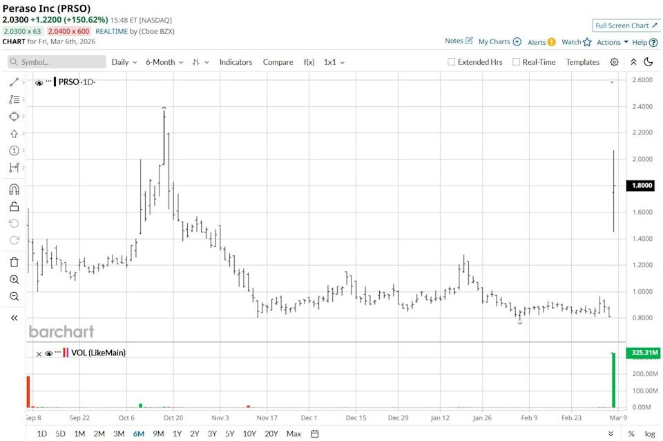 Peraso (PRSO) shares more than doubled on Friday after the San Jose-headquartered firm said it has secured a sizable defense contract from InTACT. The defense contractor has picked PRSO’s 60 GHz mmWave technology for next-generation drone Identification Friend or Foe (IFF) systems, it revealed in a press release dated March 6. Despite this meteoric run, Peraso stock remains down more than 30% versus its 52-week high. As Analysts Call for Brent Crude to Hit $120, Here Are the 3 Top-Rated Oil Stocks to Buy Now Why the Charts Say It Might Be Time for a Big Short on Google Stock S&P Futures Slip as Bond Yields Climb After Jump in Oil, Key U.S. Jobs Report in Focus Stop Missing Market Moves: Get the FREE Barchart Brief – your midday dose of stock movers, trending sectors, and actionable trade ideas, delivered right to your inbox. Sign Up Now! The InTACT partnership is a major strategic milestone, as it validates PRSO’s millimeter-wave tech for high-stakes military applications. In the context of the escalating U.S.-Iran war, the demand for sophisticated drone tech has reached a fever pitch — and Peraso’s 60 GHz beamforming chips allow for “highly directional, low-power” communication that’s nearly impossible for adversaries to jam or intercept. This stealth communication is vital for IFF systems, preventing friendly fire in cluttered warzones. For investors, this contract signals PRSO stock is pivoting from a pure-play 5G component maker to a critical defense subcontractors, opening the door to massive Department of Defense spending cycles and multi-year procurement deals. Despite InTACT news, the fundamental bear case for Peraso remains daunting given it’s still a penny stock, making it prone to extreme volatility and pump-and-dump schemes. And even financially, the picture isn’t any rosier. PRSO continues to lose money, posting a negative 39% profit margin with less than a year of cash runway. Additionally, the company more than doubled its float in 2025, massively diluting its existing shareholders just to remain listed. Still, Peraso shares were trading at less than $1 before winning the InTACT defense contract, which means the risk of a reverse split or further dilution remains on the table. PRSO shares’ relative strength index (14-day) now sits in early 80s, indicating deeply overbought conditions. Still, Wall Street sees them as undervalued at current levels. According to Barchart, the consensus rating on Peraso sits at “Moderate Buy” currently, with the mean target of $2.75 indicating potential upside of more than 60% from here. On the date of publication, Wajeeh Khan did not have (either directly or indirectly) positions in any of the securities mentioned in this article. All information and data in this article is solely for informational purposes. This article was originally published on Barchart.com
