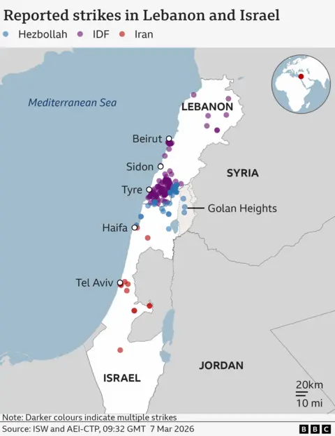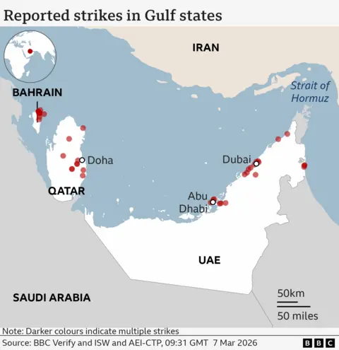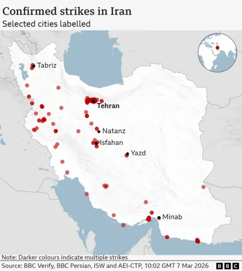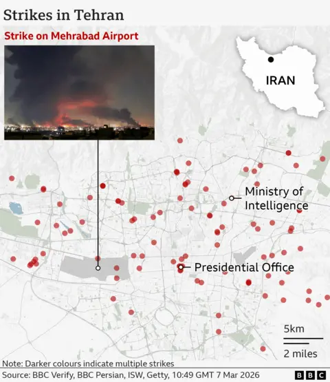 Explosions have rocked Tehran's Mehrabad airport with eyewitnesses reporting a burning plane on the tarmac, as the US-Israeli war with Iran continued for an eighth day. The attack comes after the Israel Defense Forces (IDF) said it had completed "an additional wave of strikes" targeting the Iranian regime's infrastructure. Iran has continued its attacks. There were air raid sirens in Jerusalem and Tel Aviv overnight as Israelis faced incoming ballistic missiles and drones. Most appear to have been shot down by Israel's air defence system. In the United Arab Emirates (UAE), video footage showed an explosion within the perimeter of Dubai International Airport, the result of an apparent drone strike. The US-based Human Rights Activists News Agency (HRANA) says 1,168 civilians are reported to have been killed in Iran since 28 February. Six American military personnel have been killed since the conflict began, according to the US Department of Defense. The first US-Israeli strikes on Iran began on 28 February with Israel's military saying it had targeted Iran's leadership and military infrastructure. The former Supreme Leader of Iran, Ayatollah Ali Khamenei, was killed in Tehran during the initial wave of strikes. The Israeli military said it had begun a 15th wave of attacks on Friday targeting Iranian "regime infrastructure" in Tehran and Isfahan. The announcement followed a night of heavy bombardment in the Iranian capital. The IDF released a video which it said showed the destruction of an underground bunker which was intended to be used by Iran's supreme leader. Fifty fighter jets were used in the raid, it added. BBC Verify has so far confirmed visual evidence of more than 80 attacks across the whole of Iran, including over 40 strikes in Tehran Satellite imagery reviewed by BBC Verify shows at least 11 Iranian naval vessels have been damaged or destroyed by US and Israeli strikes on the Konarak and Bandar Abbas naval bases since the war began. Other satellite imagery has revealed damage to at least three Iranian missile sites and the nuclear facility at Natanz. In Minab, in the south of Iran, at least 168 people including children were killed at a girls' school when it was hit on Saturday, Iranian authorities said. Two buildings can be seen in satellite imagery - an Iranian Revolutionary Guard Corps base has been completely flattened and the school building has partially collapsed. Analysis of the imagery reveals multiple strikes and burn marks around the school suggesting it was hit more than once. Israeli forces have also carried out air strikes in Lebanon targeting Hezbollah, the militant group that has long been backed by Iran. Hezbollah launched missiles towards Israel on 2 March following the killing of Khamenei. Tens of thousands of people evacuated their homes on Thursday after the IDF issued an evacuation warning for the southern suburbs of the Lebanese capital, Beirut. Israel's military said on Friday it had hit a Hezbollah command centre and a drone depot in Lebanon. A missile attack on 1 March, which Israel said came from Iran, killed at least nine people and injured 27 others in the city of Beit Shemesh, according to emergency services. As well as launching missiles at Israel, Iran has mounted attacks on US bases and embassies in the Middle East. It has also been accused of attacking infrastructure and civilian sites in the Gulf states Defence officials in the UAE said on Friday its forces had destroyed nine ballistic missiles. The country - which includes the popular tourist destination of Dubai - has faced almost daily missile and drone attacks since 28 February. Qatar, Bahrain, Kuwait and Saudi Arabia also reported coming under drone and missile attacks on Friday. On Sunday, six US soldiers were killed after a drone "evaded air defences" and hit a command centre at Port Shuaiba in Kuwait, the Department of Defense confirmed. Other incidents reported across the Middle East in recent days include: The US-Israeli war with Iran has also spread beyond the Middle East. On Thursday, Azerbaijan accused Iran of launching drones that injured two people in the western territory of Nakhchivan near the Iranian border. Iran denied the claim but Azerbaijan's President Ilham Aliyev called for Tehran to be held "accountable". US Defense Secretary Hegseth said on Wednesday a US submarine had sunk an Iranian warship "in international waters". The Iris Dena, which was thought to have around 130 people on board, was hit by a torpedo in the Indian Ocean off Sri Lanka. Eighty-seven sailors were killed, Sri Lankan officials said, while 32 were being treated for minor injuries. The UK has said a Royal Navy warship will sail to Cyprus after an Iranian drone crashed into the RAF base at Akrotiri on Sunday. Two more drones were intercepted on Monday, the Cypriot government said. A French warship is now in position off Cyprus while Spain has said it will deploy a frigate to the area. This story is being updated daily by BBC Verify. In an interview, the Oscar-nominee danced into some online controversy after claiming no one cares about ballet and opera. Video filmed by a witness and verified by the BBC shows a drone crashing close to the airport. A series of tornadoes tore through several cities, uprooting trees and destroying homes. Analysis suggests one of three F-15Es shot down on the war's second day came from RAF Lakenheath. Ordinary Iranians reflect on seven days of conflict and where they see their country going next.