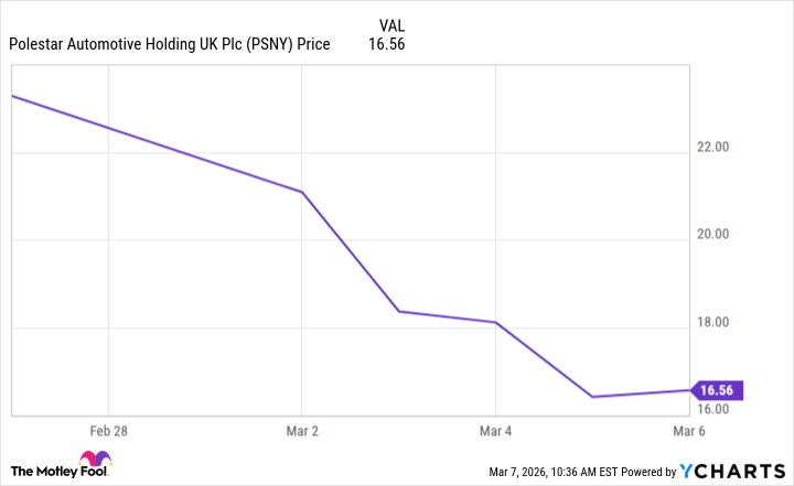 Shares of electric vehicle maker Polestar (NASDAQ: PSNY) had a rough week, even by the volatile standards of electric vehicle stocks. A rapid sell-off left Polestar's American depositary shares down 29.2% for the week by Friday's close. What drove that decline? The answer isn't obvious, but here's what we know. Will AI create the world's first trillionaire? Our team just released a report on the one little-known company, called an "Indispensable Monopoly" providing the critical technology Nvidia and Intel both need. Continue » There was no news driving this move. (I covered this company when I was a reporter. If there were news, I'd know about it, and I'd share it with you.) But here's what I do know: Someone, for some reason, bought a ton of Polestar stock in the last hour before U.S. markets closed on Friday, Feb. 27. Those purchases drove the stock price up from $18.71 at 3 p.m. ET to $23.38 at closing just an hour later. That's a gain of almost exactly 20% in just an hour of trading. Was it a fund trading a rumor? A glitch in an algorithm? A trader's mistake? Something else? Whatever it was, it was unwound pretty quickly. While the stock stayed up in that range on the following Monday, the share price fell below $20 in early trading on Tuesday and spent the rest of the week bouncing around the teens. Here's a six-month chart for some more context. We can see that the stock sold off after Polestar reported its third-quarter results on Nov. 12 -- and again after a reverse stock split took effect in December. But there was no news driving the most recent sell-off. The takeaway here is that Polestar's recent price gyrations aren't driven by its fundamentals. Shareholders may need to hold tight at least until Polestar reports its full-year 2025 results later this month. Before you buy stock in Polestar Automotive Uk Plc, consider this: The Motley Fool Stock Advisor analyst team just identified what they believe are the 10 best stocks for investors to buy now… and Polestar Automotive Uk Plc wasn’t one of them. The 10 stocks that made the cut could produce monster returns in the coming years. Consider when Netflix made this list on December 17, 2004... if you invested $1,000 at the time of our recommendation, you’d have $534,008!* Or when Nvidia made this list on April 15, 2005... if you invested $1,000 at the time of our recommendation, you’d have $1,090,073!* Now, it’s worth noting Stock Advisor’s total average return is 949% — a market-crushing outperformance compared to 192% for the S&P 500. Don't miss the latest top 10 list, available with Stock Advisor, and join an investing community built by individual investors for individual investors. See the 10 stocks » *Stock Advisor returns as of March 7, 2026. John Rosevear has no position in any of the stocks mentioned. The Motley Fool has no position in any of the stocks mentioned. The Motley Fool has a disclosure policy. What Drove Polestar Stock Down 29% This Week? was originally published by The Motley Fool
