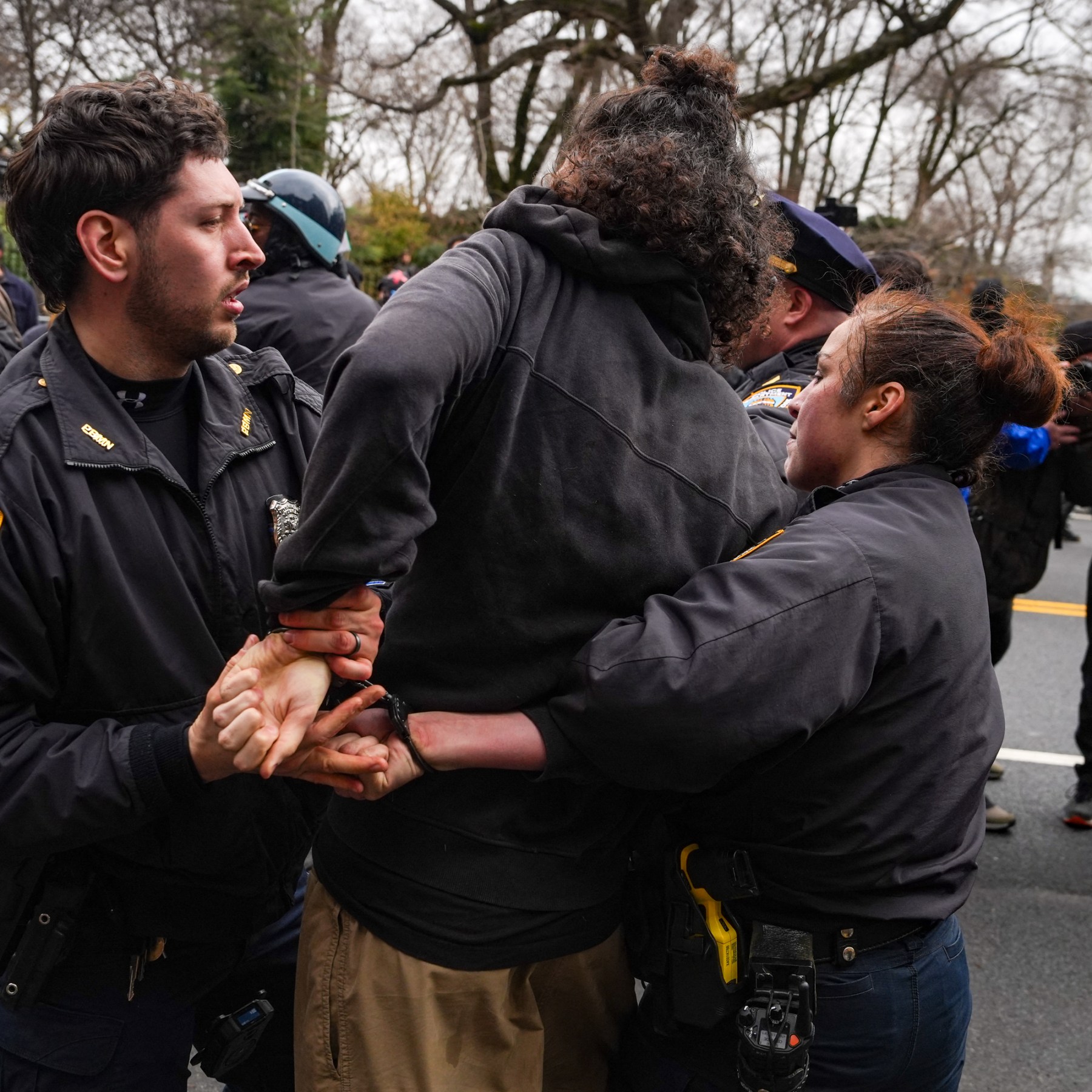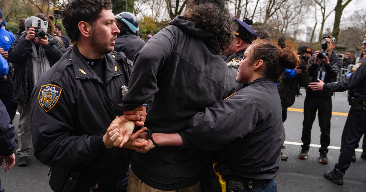 Two people have been arrested after the device was thrown, as far-right demonstrators clashed with counterprotesters. Share Save The New York City Police Department (NYPD) has said that an “improvised explosive device” was thrown during a protest outside New York City Mayor Zohran Mamdani’s home, with two men taken into custody. The statement on Sunday came a day after the incident outside the mayor’s residence, Gracie Mansion, where far-right, anti-Muslim demonstrators, led by activist Jake Lang, clashed with counterprotesters. NYPD Commissioner Jessica Tisch said a preliminary analysis has found that the item thrown by a man at the protest was “not a hoax device or a smoke bomb”. “It is, in fact, an improvised explosive device that could have caused serious injury or death,” she said, adding that further analysis would be conducted on the device, as well as a second device left near the scene. Tisch said that two men, identified as Emir Balat and Ibrahim Kayumi, were arrested at the scene. The FBI has also joined the investigation. Police had earlier said that Balat was among a group of counterprotesters when he threw the smoking device at a barrier near police. It did not explode. The device contained nuts, bolts and screws, as well as a so-called “hobby fuse”, according to police. Balat dropped a second device in the street as he fled, police said. In a statement on Sunday, Mamdani condemned Lang’s protest, but said the following violence was “even more disturbing”. “Violence at a protest is never acceptable,” he said. “The attempt to use an explosive device and hurt others is not only criminal, it is reprehensible and the antithesis of who we are.” Lang, a far-right activist who was arrested for storming the US Capitol on January 6, 2021, and pardoned by President Donald Trump last year, called Saturday’s protest in opposition to what he has described as the “Islamification” of New York City. Mamdani is the first Muslim mayor of the city, which is estimated to be home to up to 1 million Muslims. In his statement, the mayor described Lang as a “white supremacist”, adding that “such hate has no place in New York City”.