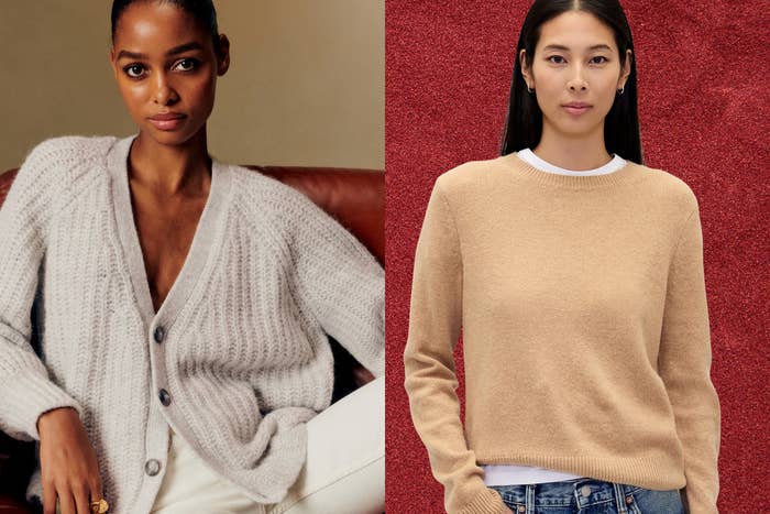 We hope you love our recommendations! While every product is independently chosen by our editors, BuzzFeed and our publishing partners may collect a share of sales or other compensation from the links on this page. You can read more about how our affiliate partnerships work in our Editorial Standards & Ethics Guide. Hint: some options are actually pretty affordable. Unless otherwise specified, all sizes in this post are listed in women's. “Before purchasing a knit, it’s helpful to know the difference between the different wools and blends,” said Kim Appelt, celebrity fashion stylist and author of Style for Everybody: A Guide to Curating Your Essential Wardrobe. You’ve got polyester blends that might feel impossibly buttery soft on first contact, but that might fall apart in the wash or after a couple wears. Then, you’ve got natural fibers like cotton and cashmere that provide next-level thermoregulating properties, durability and an expensive feel you just can’t replicate in a synthetic blend. With high-end knitwear, you get what you put into it. “Never hang knits,” said Melissa Rivers, fashion expert and former co-host of E’s Fashion Police. “If you absolutely have to, support them fully so they don’t stretch out. Otherwise, folding is always the safest bet.” We tapped the fabric experts to walk us through exactly which fabrics are worth the splurge for knitwear that lasts and actually keeps you warm season after season. “Wool is stronger and holds its shape better,” said Appelt. “It’s great for structure and warmth.” While a wool coat for outerwear is a seriously great bet for thermoregulating properties, a wool sweater provides enhanced moisture-wicking properties that are particularly suitable as base layers for working up a sweat outdoors. “Cashmere is timeless for a reason,” said Tara West, a fashion expert. “It’s ultra-soft with a silky, refined drape while providing warmth without the bulk. Even the simplest silhouettes look and feel more luxurious in cashmere.” She recommended opting for two-ply cashmere that’ll hold its shape, and to always keep your cashmere sweaters folded instead of hung to prevent stretching. Sure, cashmere is considered a luxe fabric, but it’s actually very practical, according to Rivers. “[It’s] lightweight, long-lasting and it instantly elevates even the simplest outfit,” she said. “And honestly, it just feels like a warm hug, which we all deserve.” While Appelt said cashmere “feels amazing on the skin,” the caveat here is that it does tend to pill more, making it a smart option to opt for a cashmere blend for enhanced softness, durability and shape retention. “Despite the pilling, cashmere is my absolute favorite. I love it best when it’s very thin, almost like an underlayer,” she said. “Alpaca is one of my favorite investment knit fabrics because it’s warmer than traditional wool while remaining surprisingly lightweight,” said West. “It’s also naturally hypoallergenic, which makes it ideal for anyone who finds wool itchy or irritating. I love its slightly fluffy texture and it instantly makes knits feel luxurious, cozy and chic.” She said if you opt for alpaca blends rather than 100% alpaca sweaters, the blends will shed less and retain better structure for everyday wear. “This is the ultimate closet MVP,” said West. “Cotton-cashmere blends give you the breathability of cotton with the softness of cashmere, but they’re far less delicate. They’re my top recommendation for clients who want an everyday luxury look without high maintenance.” She noted this particular fabric blend transitions seamlessly across all seasons and climates, making it ideal for “real life wear.” Quince makes some of the most affordable yet high-quality and on-trend knitwear on the market, and this cashmere sweater with relaxed drop shoulders is not to be missed. It features an of-the-moment funnel neck that gives old money vibes, all in a luxurious Grade-A Mongolian cashmere fabric that’ll keep you warm without any itchy irritation. Promising review: “I got this sweater in navy and ordered a second one in black. I love the neckline, the weight, the feel, sleeves and fit. The design is reminiscent of the 60’s. More colors please!” —Deborah G. Get it from Quince for $119.90 (available in sizes XS–XL and four colors). “This is a timeless button-front cardigan silhouette that transitions effortlessly from casual or off-duty to polished and workwear-appropriate with a quick styling change,” said West. “The lightweight knit makes it wearable year-round, and it’s a great example of an affordable piece that still looks premium and elevated.” While it’s made of a blend of polyester, acrylic and polyamide to keep the price down and softness levels up, reviewers note it’s great quality. Promising review: “I'm very impressed with this cardigan. It is a bit shorter than hip length, the material is thick and it's well made. It can be dressed up, down or worn alone. I sized up, and it has a bit of room without looking oversized.” —mjmmessina Get it from Amazon for $19.99+ (available in sizes XS–XL and 17 colors). “A thin black cashmere turtleneck is one of my wardrobe staples,” said Appelt. “Second to that is a great collared cardigan, which is a very functional and stylish piece. I love this one from Reformation and it comes in many colors. It sits close to the body and is soft on the skin. You can layer a wool coat, leather jacket or blazer over it, and any pilling that happens over time doesn’t make you look like a mess.” She noted this knitwear suits hourglass shapes because it doesn't add bulk. Get it from Reformation for $198 (available in sizes XS–XL and five colors). "For something chunky, I actually prefer a wool or wool blend,” said Appelt. “It holds the shape better and works as an outer layer, but it can still be styled under an oversized 