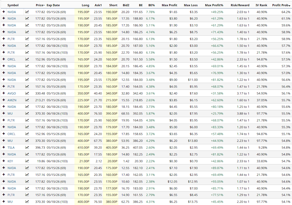 With markets in crisis, it’s a good time to check in on our bear put spread screener. A bear put spread is a vertical spread that aims to profit from a stock declining in price. It has a bearish directional bias as hinted in the name. Unlike the bear call spread, it suffers from time decay so traders need to be correct on the direction of the underlying and also the timing. If Oil Is at a Peak, Does Shorting Chevron Puts and Calls Make Sense? Stop Missing Market Moves: Get the FREE Barchart Brief – your midday dose of stock movers, trending sectors, and actionable trade ideas, delivered right to your inbox. Sign Up Now! A bear put spread is created through buying an out-of-the-money put and selling a further out-of-the-money put. The maximum profit is equal to the distance between the strikes, less the premium paid. The loss is limited to the premium paid. Let’s take a look at Barchart’s Bear Put Spread Screener for today: Some interesting trades here with impressive Max Profit Percentage. Let’s take a look at the first item in the table – a bear put spread on Nvidia (NVDA). NVDA Bear Put Spread Example Using the May 15 expiry, this trade involves buying the $195 put and selling the $190 put. The price for the trade is $3.35 which means the trader would pay $335 to enter the trade. This is also the maximum loss. The maximum gain be calculated by taking the width between the strikes and subtracting the premium paid: 5 – 3.35 x 100 = $165. The breakeven price for the trade is equal to the long put strike, less the premium. In this case, that gives us a breakeven price of $191.65. Let’s look at another example. This time on Palantir (PLTR). Palantir Bear Put Spread Example The first Palantir bear put spread is also using the May 15 expiry and involves buying the $170 trike put and selling the $165 strike put. The cost of the trade is $320 which is also the maximum loss with the maximum possible gain being $180. The maximum gain would occur if Palantir stays below $170 on the expiration date. Let’s look at another example, this time on Oracle (ORCL). Oracle Bear Put Spread Example The Oracle trade is also using the May 15 expiry and involves buying the $165 strike put and selling the $160 strike put. The cost of the trade is $350 which is also the maximum loss with the maximum possible gain being $150. The maximum gain would occur if AVGO stock stays below $165 on the expiration date. Mitigating Risk Thankfully, bear put spreads are risk defined trades, so they have some build in risk management. For each trade consider setting a stop loss of 30% of the max loss. Please remember that options are risky, and investors can lose 100% of their investment. This article is for education purposes only and not a trade recommendation. Remember to always do your own due diligence and consult your financial advisor before making any investment decisions. On the date of publication, Gavin McMaster had a position in: NVDA, PLTR. All information and data in this article is solely for informational purposes. This article was originally published on Barchart.com