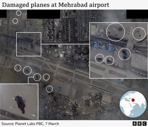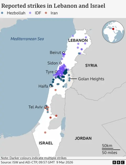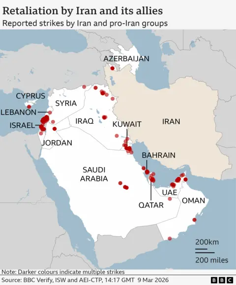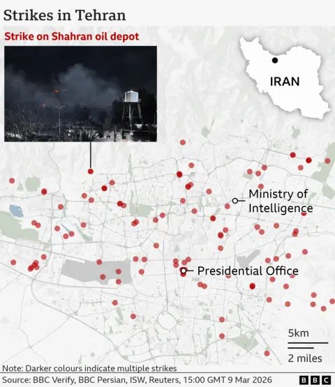 The Israeli military says it has launched more strikes on Iran as well as hitting targets in Lebanon, as the US-Israeli war with Iran continues for a tenth day. In Turkey, the defence ministry said a ballistic missile launched from Iran was destroyed by "Nato air and missile defence assets". Qatar, Kuwait, the United Arab Emirates (UAE) and Saudi Arabia reported new attacks overnight. The UAE says it intercepted 17 ballistic missiles and six drones from Iran on Monday. The US-based Human Rights Activists News Agency (HRANA) says 1,205 civilians are reported to have been killed in Iran since 28 February. Seven US service personnel have been killed since the start of the conflict, according to the Department of Defense. The first US-Israeli strikes on Iran began on 28 February with Israel's military saying it targeted Iran's leadership and its military infrastructure. The former Supreme Leader of Iran, Ayatollah Ali Khamenei, was killed in Tehran during the initial strikes. On Sunday evening the Israel Defense Forces (IDF) said "approximately 3,400 strikes" had been carried out so far with more than 150 Iranian defence systems disabled. BBC Verify has seen footage of smoke and fires at four Iranian oil facilities following Israeli strikes. Iran's foreign ministry said these attacks had released "hazardous materials and toxic substances into the air" and accused Israel of "poisoning civilians". IDF spokesman Lt Col Nadav Shoshani said such sites were a "legal, military target". BBC Verify has so far confirmed visual evidence of more than 110 attacks across Iran, including at least 49 strikes in Tehran. Satellite imagery reviewed by BBC Verify since the conflict began on 28 February has shown: In Minab, in the south of Iran, at least 168 people including children were killed at a girls' school when it was hit on 28 February, Iranian authorities said. Two buildings could be seen in satellite imagery - an Iranian Revolutionary Guard Corps (IRGC) base was left completely flattened and the school building partially collapsed. Analysis of the imagery revealed multiple strikes and burn marks around the school suggesting it was hit more than once. Experts who have analysed a video showing a missile moments before it struck an IRGC base next to the school have told BBC Verify the munition was a US Tomahawk. Neither Israel nor Iran are known to possess Tomahawks, experts said. The governments of Saudi Arabia, Kuwait, Bahrain and the UAE all reported what they said were Iranian missile and drone attacks on Sunday. Kuwait said it contained a major fire in a government office block following a reported attack during the early hours of the morning. The UAE said its air defences intercepted 16 ballistic missiles and 113 drones on Sunday. The latest attack came after an apparent drone strike hit Dubai International airport on Saturday. The UAE said that in the past week 238 missiles and 1,422 drones had been launched at the country. On Monday 9 March, Bahrain said a drone attack injured 32 civilians - the highest number of casualties in a single incident in the Gulf states since the war began. Bahrain officials reported that a drone attack on 9 March caused a fire at its largest oil refinery. Oman, Qatar, Saudi Arabia and Iraq have also come under attack. Shipping in the Gulf has been severely disrupted after Iran threatened to "set fire" to vessels in the Strait of Hormuz through which 20% of the world's oil and gas flows. Israeli forces have carried out air strikes in Lebanon targeting Hezbollah, the militant group that has long been backed by Iran. Hezbollah launched missiles towards Israel on 2 March following the killing of Khamenei. Israel said it carried out a "precise strike" on the Lebanese capital Beirut on Sunday targeting commanders from the Quds force - the foreign operations arm of Iran's Revolutionary Guards. The Lebanese health ministry said four people died in an Israeli strike on a hotel in central Beirut. According to the health ministry, 394 people have been killed in the past week from Israeli strikes. A missile attack on 1 March, which Israel said came from Iran, killed at least nine people and injured 27 others in the city of Beit Shemesh, according to emergency services. The US-Israeli war with Iran has also spread beyond the region. This story is being updated daily by BBC Verify. Coventry councillor Mattie Heaven says she is in touch with anti-terror police almost daily. Airports across the US are experiencing extended wait times due to the partial government shutdown, which began on 14 February. Concern has grown for team after one critic called them 'wartime traitors' for failing to salute during the Iranian anthem. The city's police commissioner says a suspect used an improvised device that could have caused "serious injury or death". As turmoil continues in the Middle East, the price of crude oil rose to more than $100 a barrel on Monday.