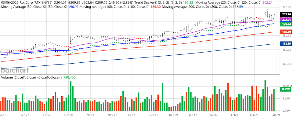 RTX (RTX) recently hit new all-time highs of $214.50 and has robust technical momentum. RTX has gained nearly 63% over the past year. The stock maintains a 100% “Buy” technical opinion from Barchart. Analyst sentiment is mixed. Some see RTX as overvalued or a “Hold” at current levels. Author’s Note: RTX was last featured on Sept. 24 when it closed at $163.03. Since then, it has gained 28.66%. It came up again in my screener today. Valued at $281 billion, RTX (RTX) is an aerospace and defense company. Its operating segments include Collins Aerospace, Pratt & Whitney, Raytheon Intelligence & Space, and Raytheon Missiles & Defense. RTX Corporation, formerly known as Raytheon Technologies Corporation, is headquartered in Arlington, Virginia. ‘When You See One Cockroach, There are Probably More’: Blackrock Forced to Halt Redemptions As $2 Trillion Private Lending Bubble Starts Showing Cracks Analysts Say These Are the Top 3 Stocks to Buy Amid the U.S.-Israel War on Iran Iran War, CPI and Other Key Thing to Watch this Week Stop Missing Market Moves: Get the FREE Barchart Brief – your midday dose of stock movers, trending sectors, and actionable trade ideas, delivered right to your inbox. Sign Up Now! I found today’s Chart of the Day by using Barchart’s powerful screening functions to sort for stocks with the highest technical buy signals; superior current momentum in both strength and direction; and a Trend Seeker “buy” signal. I then used Barchart’s Flipcharts feature to review the charts for consistent price appreciation. RTX checks those boxes. Editor’s Note: The technical indicators below are updated live during the session every 20 minutes and can therefore change each day as the market fluctuates. The indicator numbers shown below therefore may not match what you see live on the Barchart.com website when you read this report. These technical indicators form the Barchart Opinion on a particular stock. RTX scored an all-time high of $214.50 on March 3. RTX has a Weighted Alpha of +67.10. It has a 100% “Buy” opinion from Barchart. The stock has gained 63.52% over the past 52 weeks. RTX has its Trend Seeker “Buy” signal intact. The stock recently traded at $209.76 with a 50-day moving average of $196.96. RTX has made 8 new highs and is up 5.59% over the past month. Relative Strength Index (RSI) is at 59.59. There’s a technical support level around $205.62. $281 billion market capitalization. 32.46x trailing price-earnings ratio. 1.31% dividend yield. Revenue is projected to grow 5.42% this year and another 6.68% next year. Earnings are estimated to increase 8.3% this year and an additional 10.24% next year. The Wall Street analysts followed by Barchart gave the stock 13 “Strong Buy,” 1 “Moderate Buy,” 7 “Hold,” and 1 “Sell” opinion with price targets between $160 and $238. Value Line rates the stock “Above Average” with price targets between $133 and $251. CFRA’s MarketScope rates the stock a “Hold” with a price target of $216. Morningstar thinks the stock is 17% overvalued with a fair value of $179. 3,107 investors following the stock on Motley Fool think it will beat the market while 214 think it won’t. 173,890 investors are following the stock on Seeking Alpha, which rates it a “Hold.” Short interest is 0.92% of the float with 1.91 days to cover the float. RTX operates in a highly competitive market with rapid technological advances. Defense stocks are hot right now. They have a very broad following from both professional and individual investors, and very low short interests Additional disclosure: The Barchart Chart of the Day highlights stocks that are experiencing exceptional current price appreciation. They are not intended to be buy recommendations as these stocks are extremely volatile and speculative. Should you decide to add one of these stocks to your investment portfolio it is highly suggested you follow a predetermined diversification and moving stop loss discipline that is consistent with your personal investment risk tolerance. On the date of publication, Jim Van Meerten did not have (either directly or indirectly) positions in any of the securities mentioned in this article. All information and data in this article is solely for informational purposes. This article was originally published on Barchart.com