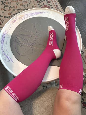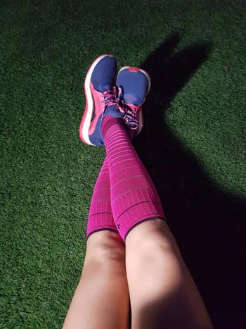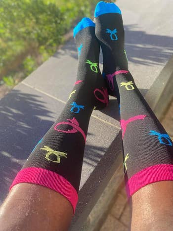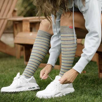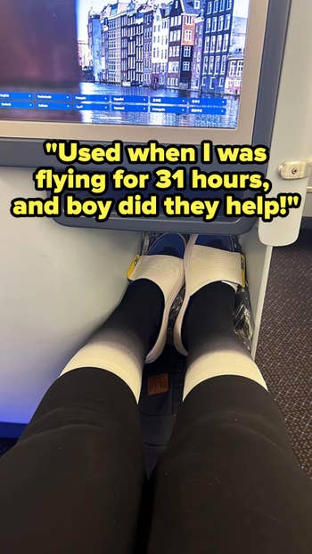 We hope you love our recommendations! While every product is independently chosen by our editors, BuzzFeed and our publishing partners may collect a share of sales or other compensation from the links on this page. You can read more about how our affiliate partnerships work in our Editorial Standards & Ethics Guide. Leg pain, fatigue, and swelling don't have to put a damper on your travel plans. Booking a flight to a far-off destination is exciting, but travel isn't always easy on our bodies; in fact, it can come with a lot of discomfort, particularly in the lower body region. Compression socks are a popular solution for the leg pain, swelling, and fatigue that can come along with long plane rides or 12-hour days on your feet spent exploring a new locale — but it's important to know exactly what you're buying and why before filling up your carry-on with compression socks. Compression socks are measured in mmHg (which stands for millimeters of mercury), and the higher the number, the greater the compression. Most compression socks offer what's called graduated compression, which puts the greatest squeeze on your ankles and lightens the pressure as it goes up your leg. For travel purposes, graduated compression socks offering light to firm compression is likely what you're looking for. That being said, it's important to talk to your doctor about whether compression socks are a good option for you, and the right level of compression for your needs. (You can also read more about compression socks at the Cleveland Clinic.) The best compression socks for travel include those that are breathable, moisture wicking, and cushioned, plus shorter length options for those who don't want a knee-high sock. Some brands offer extended size ranges for wide calves, and fortunately for those who like to stay stylish while jetsetting, they come in a bunch of cute styles too. Level of compression: 18–25 mmHg (moderate/firm) Wellow compression socks check all the boxes for a solid pair of travel compression socks. They come in a bunch of cute colors and wide calf sizes, and they offer moderate compression to help support blood circulation in your legs, reduce fatigue, and prevent swelling in your feet. Wellow socks are made from bamboo-derived viscose, which means they're moisture-wicking and breathable, in case you're prone to sweaty feet. And they're super soft (not scratchy) — they were literally designed to feel like a gentle hug on your legs. Promising review: "My legs feel so much better when I wear compression socks on a long flight. I normally have three complaints about normal compression socks: I get too hot, they come up too high and pinch behind my knee, and my calves are wide so they're too tight. These socks are really nice — they're thick but not too hot. I managed to keep them on for most of a 10-hour flight." —Paula Get a pair from Amazon for $29.99 (available in sizes S–XL and M–XL Wide (on a separate listing), and many styles). Level of compression: 15–20 mmHg (moderate) Comrad nylon compression socks that are thinner and stretchier than some other pairs, so they're a great lightweight option for long travel days. And if you're in need of odor control, these have antimicrobial silver ion technology that helps stop the stink so you can wear them 3–4 times before washing — definitely a plus if you're traveling with just a carry-on. Also, lots of pregnant reviewers mention these really helped with swelling while flying. Promising reviews: "Just wore these on a 14.5-hour flight in my second trimester, and my feet did not swell at all! I also got up every two hours and drank a lot of water / electrolytes, but I’ve never gotten off a long flight with no swelling before." —AtticusF "These have been my favorite compression socks to wear while pregnant. I like that they are thinner and nylon so my feet don't get too hot. They stay in place, go up to my knee, and really help with the swelling." —Shayna Get a pair from Amazon for $33.99 (available in sizes S–XL and M–L Wide, and 27 styles). Level of compression: 15–20 mmHg (moderate), 20–30 mmHg (firm), and 30–40 mmHg (medical grade) Vim & Vigr compression socks that come in a ton of styles and include wide-calf sizing, and they even let you pick between three levels of compression. Their socks also come in four different materials — cotton, merino wool, nylon, and moisture-wicking nylon — so you can shop by your preference! Note: Vim & Vigr socks are available with 30–40 mmHg medical-grade compression, but talk to your doctor before choosing that level of support. Promising review: "These socks put the fun in functional. They are super comfy and not hard to put on. Plus, they look great. I love stripes so I had to get a pair. I rocked them out on recent flight and my legs thanked me for it. I have 16-inch circumference calves and they fit great." —Kathryn C. Get a solid-colored pair from Vim & Vigr for $38+ (available in sizes S–XL and S–XL Wide, and three compression levels). And shop all their other compression sock styles, with four material options. Physix Gear compression socks, an Amazon-popular pair with over 60,000 5-star ratings. Reviewers rave about how these help with fatigue, leg cramps, and swelling during long travel days, and they're popular for workouts and sports use as well. Check out our full Physix Gear compression socks review for more deets. Promising review: "These are my favorite, go-to compression socks for travel. This is the second pair I’ve purchased. I wear these on short-haul flights (1.5–5 hours) and long-haul flights (10+ hours) and my legs feel great, no swelling, no fatigue at all. I bought this second pair for flights to France and the UK, and they didn’t bunch up, roll down or feel too tight — but be sure to get your correct size so they fit comfortably." —California Pointe Get a pair from Amazon for $18.63+ (available in sizes S–XXL and 13 styles). Fitrell