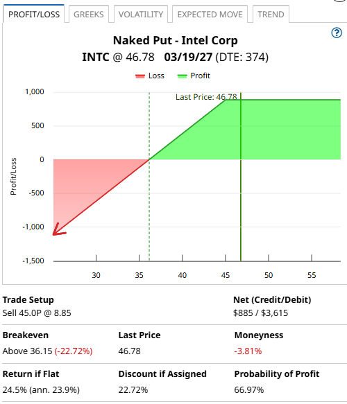 Intel Corp (INTC) stock broke above the 50-day moving average on Monday and is showing positive accumulation on the breakout. One bad thing about INTC stock is that it currently doesn't pay a dividend. 2 Ways to Profit from a Fading Tesla Stock Price Target a Profit Zone in Microsoft Stock Between $350 and $390 with This Spread Trade Why the Smart Money May Be Abandoning the Bull Case for Chevron Stock Tired of missing midday reversals? The FREE Barchart Brief newsletter keeps you in the know. Sign up now! But what if we could use options to manufacture our own dividend? Let's say I have $4,500 to invest into INTC stock, I could simply buy 100 shares and hope the stock rises. But, if I want a more conservative play, I could sell a March 19, 2027 put with a strike price of $45 and set aside the $4,500 in case I am assigned on the short put. That $45-strike put generates around $885 in option premium in around twelve months. So, my $4,500 investment into INTC is giving me a 23.9% annualized "dividend". Much like owning INTC shares, if the stock drops, I'm going to lose money in the short-term. If INTC is below $45 in March next year, then I will be forced to buy 100 shares at $45. The breakeven price is equal to the strike price less the premium received, which in this case would be $36.15, which is a 22.72% discount on the current stock price. So if INTC is below $36.15, at expiration the trade loses money. But, if INTC stays above $45 then I achieve a 24% per annum return when the put expires worthless. Cash secured puts are a bullish strategy but are considered slightly less bullish than owning INTC stock because the potential gains are limited to the premium received. The second risk with the trade is that if INTC stock goes on a huge rally, we miss out on any upside. The most we can make is the $885 from the option premium. The $45-strike put currently has a delta of 34, so selling this put gives an exposure roughly equivalent to owning 34 shares of INTC stock, although this will change as the stock moves up and down. It also means the put has a roughly 66% chance of expiring worthless. One method which can help cut the risk is to turn the trade into a spread and buy a $35-strike put. This turns the trade into a bull put spread and cuts the risk from $4,500 to around $1,000. There are lots of interesting scenarios you can create with options. Intel Corporation, one of the world's largest semiconductor company and primary supplier of microprocessors and chipsets, is gradually moving into data-centric businesses such as AI and autonomous driving. Intel is a dominant player for microprocessors in both consumer and enterprise markets. Data Center Group, Internet of Things Group, Mobileye, Non-Volatile memory solutions group and Programmable solutions Group and All Other business units form the crux of Intel's data-centric business model. DCG segment deals with servers, workstations and other products for cloud, enterprise, and communication infrastructure market. IOTG offers high-performance compute solutions and embedded applications. PSG segment offers programmable semiconductors, primarily FPGAs and structured ASICs. Mobileye is engaged in developing computer vision and machine learning-based sensing, data analysis, localization, mapping, and driving policy technology for ADAS and autonomous driving. Implied volatility is currently 62.62% compared to a twelve month low of 37.87% and a twelve month high of 94.69%. Of the 45 analysts covering INTC, 5 have a Strong Buy rating, 1 has a Moderate Buy rating, 34 have a Hold rating, 1 has a Moderate Sell rating and 4 has a Strong Sell rating. Please remember that options are risky, and investors can lose 100% of their investment. This article is for education purposes only and not a trade recommendation. Remember to always do your own due diligence and consult your financial advisor before making any investment decisions. On the date of publication, Gavin McMaster did not have (either directly or indirectly) positions in any of the securities mentioned in this article. All information and data in this article is solely for informational purposes. This article was originally published on Barchart.com