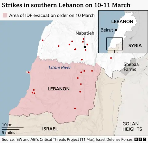 The war between Israel and Hezbollah is continuing to escalate, with hundreds of people killed in Lebanon and hundreds of thousands more forced from their homes since the beginning of the month. Much of Israel's air and ground operations have focused on the south of Lebanon. The BBC spent Wednesday with rescue workers in the city of Nabatieh, witnessing the pace and scale of bombings there - a day before the city and much of the land around it was included in a new set of sweeping Israeli evacuation orders. The late afternoon silence in Nabatieh was broken by the whistle of a missile and the boom of an explosion in the valley beneath the Nabih Berri government hospital. Medics and displaced people rushed to the hillside to peer beneath as ambulances raced to the scene with their sirens blaring. "See how big it is," one man said. "It lit up the sky." Forty-three seconds later, another explosion sounded nearby. Two more followed. All sent plumes of grey smoke into the air around Nabatieh, clinging over apartment buildings and businesses, as chaotic search and rescue efforts got under way. An emergency worker shouted out "follow the smoke" as ambulances tried to find their way to the scenes of the multiple strikes. Among those racing across the city was Hussein Fakih, the regional head of the government-run Lebanese Civil Defence - the country's primary firefighting, first aid and rescue force. He said he had been seeing the same things "almost every day" since war resumed on 2 March between Israel and the Iran-backed armed group and political movement Hezbollah - which is proscribed as a terrorist organisation by the UK, US and other countries. "Whether that's firefighting… or rescue operations, or searching under the rubble, or retrieving the bodies," he said. Lebanon was pulled into the conflict between Iran, Israel and the US when Hezbollah launched rockets and drones into Israel, in retaliation for the assassination of Iran's supreme leader. The group also cited almost daily Israeli strikes against it since a ceasefire ended their last war in 2024. Israel said Hezbollah's attack justified launching a broader campaign against the group, and has since launched hundreds of strikes on Lebanon. It has accused Hezbollah of systematically using civilian infrastructure and areas for military activities, which the group has previously denied. The BBC heard or went to the scenes of seven Israeli strikes on Wednesday. The ones we saw the aftermath of in Nabatieh were in areas that were not under official Israeli evacuation orders at the time, and locals and first responders said no warnings had been given. The Israeli military did not respond to multiple BBC requests for comment about the specific targets of these strikes. At the site of one of the explosions, an acrid smell lingered among the piles of debris scattered in front of a residential building. Sofas had been thrown to the ground by the strength of the explosion. A small fire continued to burn inside the building, but rescuers at the scene rushed away to respond to one of the other strikes, saying no one had been killed or injured there. One local resident walked up to assess the scene. He said only civilians had lived there, before walking away. In the building next door, laundry was hung out to dry next to a pair of children's shoes, but no-one appeared to be inside. Before Thursday's orders, much of Nabatieh already had the feeling of a ghost town. The city - located just 16km (10 miles) from the border with Israel - is one of the biggest in southern Lebanon. Many residents had fled in fear, hoping to find safety further north after the war began. Most Israeli strikes have focused on southern Lebanon, the eastern Bekaa Valley, and the southern suburbs of Beirut, known as the Dahieh - the heartlands of Hezbollah and of Lebanon's Shia community. But some have hit areas elsewhere, including in the centre of Beirut. But despite the escalating war, some residents in Nabatieh had stayed behind, saying they could not afford to move, or find any space at shelters, or simply did not want to leave their homes. Among them was a family whose home was destroyed by one of the strikes on Wednesday. "We didn't leave because we saw on TV how people are stranded on the roads and sidewalks and I didn't want that for my two grandkids so I decided to stay and trust in God's will," said 60-year-old Mona Najem. The family were having lunch and watching TV, she said, when "suddenly half the house collapsed and we couldn't see a thing - windows and glass got shattered". She grabbed her two grandchildren - aged seven and 10 - and went to hide in a small room that was still standing, until rescuers arrived and took them to the local al-Najde hospital. "It is six of us [living there], and we are all fine - thanks to God. My older son stepped on a piece of shattered glass but it's minor, otherwise God was merciful," she said from a hospital bed. Opposite Mona, her other son was holding an oxygen mask to his mouth and could not speak. She said it was because of the shock of what had happened. "We didn't leave in the previous war and we got used to it. Even through this, the children have sometimes played outside under the warplanes. After this hit I felt distress and I feared for them [but] they turned out to be tougher than me," she said as her grandchildren smiled beside her. The home of 69-year-old Entisar Yassine was also damaged by the impact of a strike, while she was on her wheelchair inside. When the BBC arrived at the apartment with rescue workers, Entisar appeared scared and disorientated. She had attempted to clean some of the glass that had shattered in her apartment. "I was very scared when that strike happened. I was already afraid, and my heart kept pounding from the panic and fear," she later told the BBC from hospital. She said she had "wanted to leave" but didn't know where to go. Mona had her leg amputated two years ago because of a medical c