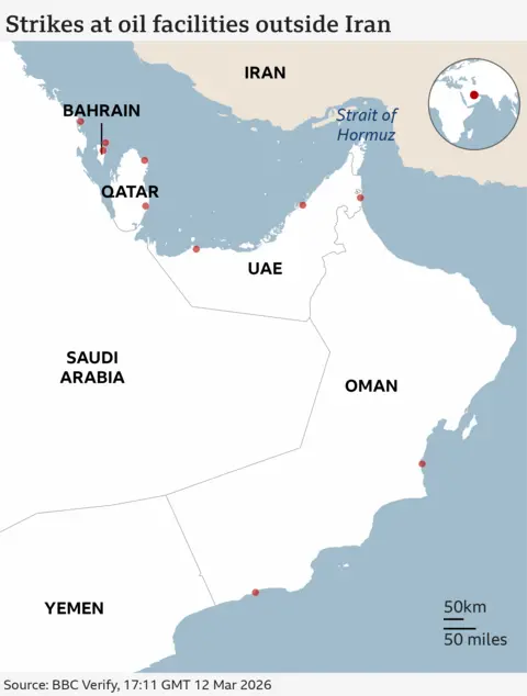 Six ships have been attacked in the Gulf in less than 48 hours, bringing the total of vessels attacked since the start of the war to 18, according to reports by UK Maritime Trade Operations (UKMTO) and the maritime intelligence company Vanguard. It comes as Iran's new supreme leader Mojtaba Khamenei vowed to keep blocking the Strait of Hormuz in his first public statement on Thursday. Verified footage showed two tankers on fire in Iraqi waters at the north of the Gulf late on Wednesday and UKMTO reported the ships had been "struck by an unknown projectile". Safesea Vishnu, a US-owned vessel heading to India, was hit by an "unmanned speed boat carrying explosives" which "rammed into it, resulting in a major fire onboard", Indian authorities said. Video filmed from a small boat - and authenticated by BBC Verify - shows a large explosion on the Safesea Vishnu before the boat speeds away and those on board can be heard celebrating. The head of the General Company for Iraqi ports said it rescued 38 crew members from the attacked ship and that one person has died, according to the Iraqi News Agency. There were no reported injuries on the second vessel, the Maltese-flagged Zefyros. Three crew members are still missing and believed to be trapped in the engine room of another vessel, the Thai-flagged Mayuree Naree, that was hit while transiting through the Strait of Hormuz on Wednesday morning, the ship's owner told BBC Verify. "In theory, Iran can keep threatening shipping indefinitely," said Nick Brown from the defence intelligence company Janes. "Iranian forces are well practised in decoy, camouflage and subterfuge tactics, and many of their smaller weapons can be disguised in commercial vehicles, hidden in buildings and out of sight along Iran's long coastline," he added. "Small craft, robot craft, small submarines, shore based missiles, even mobile artillery - all of which Iran has - could attack ships as they sail past," said Professor Michael Clarke from King's College London. The latest data from the ship tracking firm MarineTraffic shows that just six vessels have passed through the strait since Monday. Tracking these ships has been difficult as some may have been turning off their onboard trackers, as Iran continues to target vessels. Signal jamming is also causing many ships to transmit misleading location data. The locations of the strikes on vessels reported by UKMTO and Vanguard show the attacks have spanned the length of the Gulf and the Gulf of Oman, but most have been concentrated near the Strait of Hormuz. About 20% of the world's oil - around 20 million barrels per day - usually transits through this narrow corridor between Iran in the north and Oman and the United Arab Emirates in the south. It is also a key trading route for other commodities such as helium, the chemical sulphate, and urea, which is used to produce fertiliser. "No ship wants to pass through there and no insurer wants to insure those ships that are passing through there. This is the scenario that we've all been predicting for a long time - the closing of the strait - which is a nightmare," said Neil Quilliam from the Chatham House think-tank. Ten of the ships reported by UKMTO and Vanguard as having been attacked since 28 February are tankers, according to MarineTraffic data. Iran has said it would "not allow even a single litre of oil" heading for the US, Israel and their partners to pass through the strait. In addition to strikes on oil tankers, we have also verified 10 strikes on oil facilities and depots since the conflict began on 28 February, spanning Bahrain, Oman, Saudi Arabia, the UAE and Qatar. Energy prices have soared since the start of the war, approaching $120 a barrel on Monday. A spokesperson for Iran's military command, Ebrahim Zolfaqari, this week warned: "Get ready for the oil barrel to be at $200 because the oil price depends on the regional stability which you have destabilised." Thirty two countries unanimously voted to release 400 million barrels of oil to offset the "effective closure" of the shipping channel, the International Energy Agency (IEA) announced on Wednesday. US President Donald Trump told his supporters in Kentucky on Wednesday the decision would "substantially reduce oil prices" and earlier described the fluctuations in price of oil as a "matter of war". Trump last week pledged a military escort for oil tankers moving through the Strait of Hormuz "if necessary", but experts have told BBC Verify it is unlikely this could guarantee the safety of every ship. "If the US intention is to escort all commercial vessels, this would require diverting many assets away from other tasks," said Professor Basil Germond, a visiting fellow at the Royal Navy Strategic Studies Centre. "Even if a convoy is 90% effective, which ship owners and crew unions are prepared to play Russian roulette in one of them?" said Clarke. US Central Command released footage on Wednesday of what it described as strikes on 16 mine-laying ships in the Iranian navy. The Iranian military inventory includes the Sadaf-02 sea mine, designed to sit just below the waterline and detonate after contact with a passing ship, plus the more-advanced Maham-2, which sits deeper and detonates when it detects a moving ship above through magnetic or sound sensors. There have so far been no reports of ships hitting mines. "The regime in Tehran has this asymmetric power. It costs them nothing compared to the cost of defending commercial shipping," said Germond. "Will this proposed escort convince shipping companies that the strait is safe enough? It is a question of who is more credible: the US Navy or the Iranians," he said. "And the proof will only be in the pudding." Additional reporting by Paul Brown, Becky Dale and Shruti Menon. It comes as Iranian attacks on ships intensify in the crucial Strait of Hormuz waterway. British forces based in Iraq shot down two drones overnight, Defence Secretary John Healey has confirmed. Iran sa