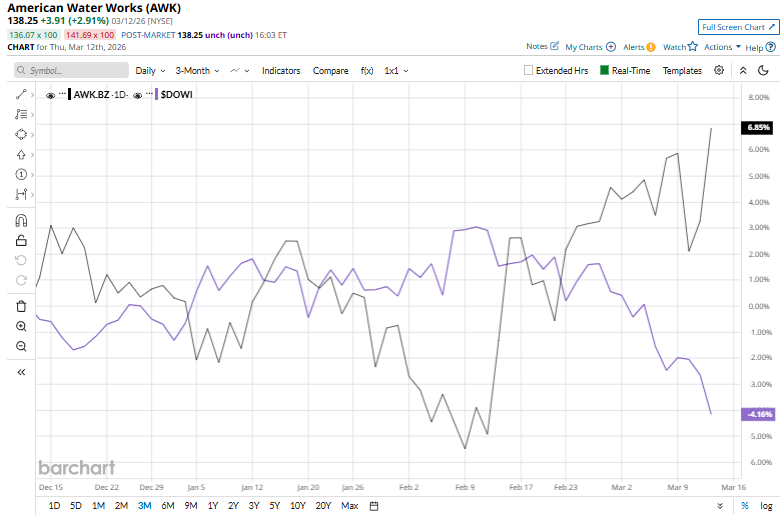With a market cap of $26.2 billion, American Water Works Company, Inc. (AWK) is the largest publicly traded water and wastewater utility company in the United States, headquartered in Camden, New Jersey. The company provides drinking water, wastewater, and other related services to residential, commercial, industrial, and government customers across the U.S. Companies valued at $10 billion or more are generally considered “large-cap” stocks, and American Water Works fits this criterion perfectly. American Water Works plays a critical role in supplying safe and reliable water services while investing in long-term infrastructure and environmental sustainability initiatives across the U.S. water utility sector. SoFi Stock Outlook: Can SoFi Technologies Recover After a 30% Drop? Stocks Slump on Iran War and Credit Woes Qualcomm Stock Warning: Why Bank of America Is Betting That QCOM Will Underperform Stop Missing Market Moves: Get the FREE Barchart Brief – your midday dose of stock movers, trending sectors, and actionable trade ideas, delivered right to your inbox. Sign Up Now! Shares of the water utility company have declined 11.1% from its 52-week high of $155.50. Over the past three months, its shares have dipped 5.1%, trailing the Dow Jones Industrial Average’s ($DOWI) 3.7% decline during the same time frame. Over the past six months, AWK shares have plunged marginally, lagging behind DOWI’s 1.8% return. In addition, shares of American Water Works have dropped nearly 1.9% over the past 52 weeks, compared to DOWI’s 12.9% rally over the same time frame. AWK has seen immense volatility over the past year, but has swiftly climbed over its 50-day moving average since mid-February and over its 200-day moving average recently. American Water Works reported its FY2025 Q4 results on Feb. 18, and its shares dipped 1.8%. The company posted adjusted earnings of $1.24 per share, which missed analysts’ expectations of $1.28 but increased 7.8% year over year from $1.15 in the prior-year quarter. Its revenue rose 5.8% year over year to $1.27 billion. However, operating expenses rose 8.1% to $866 million due to an increase in employee-related costs, increased production costs, which include higher purchased power and purchased water costs and usage, as well as general taxes associated with increased capital investment. Looking ahead, the company affirms its 2026 adjusted EPS guidance range of $6.02 to $6.12. AWK stock has also lagged behind its rival, Essential Utilities, Inc. (WTRG). WTRG stock has gained 7.2% over the past six months and 6.5% over the past 52 weeks. Due to AWK’s weak performance, analysts are cautious about its prospects. The stock has a consensus rating of “Hold” from the 12 analysts covering the stock, and the mean price target of $140.80 indicates a marginal premium to current price levels. On the date of publication, Kritika Sarmah did not have (either directly or indirectly) positions in any of the securities mentioned in this article. All information and data in this article is solely for informational purposes. This article was originally published on Barchart.com