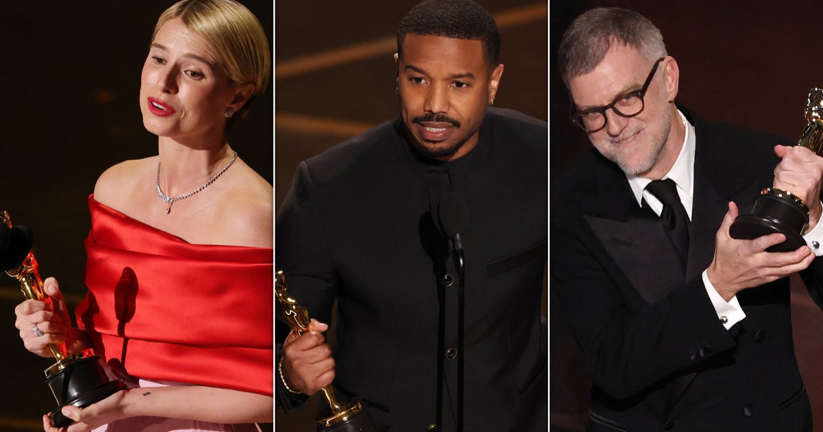 The 98th Academy Awards kept film fans on the edge of their seats as two critically acclaimed thrillers vied for the most wins of the night. Hosted by Conan O’Brien at Hollywood’s Dolby Theater on Sunday, the competition ended up being a dramatic back-and-forth between “Sinners” and “One Battle After Another.” “Sinners” scooped up a record-shattering 16 nods, including Best Picture, Best Director and Best Original Screenplay, when nominations were announced near the end of January. But director Ryan Coogler’s supernatural-infused take on the Jim Crow South had Paul Thomas Anderson’s relentless political picture hot on its trail all awards season, as it scooped up best film at both the Golden Globes and BAFTA Awards, as well as at industry honors for the Directors and Producers guilds. In the end, “One Battle” emerged as the victor, racking up six trophies, including Best Picture, Best Adapted Screenplay and Best Director, while “Sinners” earned four. The vampire film’s leading man Michael B. Jordan did snag the Best Actor accolade for his double performance as the Smokestack twins, outshining “Marty Supreme’s” Timothée Chalamet, “One Battle” star Leonardo DiCaprio, Wagner Moura of Brazil’s “The Secret Agent” and Ethan Hawke of “Blue Moon.” Best Actress went to “Hamnet’s” Jessie Buckley, whose win for the Shakespearean family tragedy seemed all but guaranteed after she practically swept the category during almost every other award ceremony this season. With her Oscar, she is now the first Irish person to win the top female lead. Guillermo del Toro’s Gothic literary adaptation, “Frankenstein,” dominated the technical categories, with its creative teams collecting Best Costume Design, Best Makeup and Hairstyling and Best Production Design. Other memorable moments included a tie in the Best Live-Action Short set, the very first Best Casting award and cinematographer Autumn Durald Arkapaw making history as the first woman to win an Oscar for her craft. For a complete list of the winners, look no further: “Bugonia” “F1” “Frankenstein” “Hamnet” “Marty Supreme” WINNER — “One Battle After Another” “The Secret Agent” “Sentimental Value” “Sinners” “Train Dreams” WINNER — Paul Thomas Anderson, “One Battle After Another” Ryan Coogler, “Sinners” Josh Safdie, “Marty Supreme” Joachim Trier, “Sentimental Value” Chloé Zhao, “Hamnet” Best Actor Timothée Chalamet, “Marty Supreme” Leonardo DiCaprio, “One Battle After Another” Ethan Hawke, “Blue Moon” WINNER — Michael B. Jordan, “Sinners” Wagner Moura, “The Secret Agent” WINNER — Jessie Buckley, “Hamnet” Rose Byrne, “If I Had Legs I’d Kick You” Kate Hudson, “Song Sung Blue” Renate Reinsve, “Sentimental Value” Emma Stone, “Bugonia” Benicio Del Toro, “One Battle After Another” Jacob Elordi, “Frankenstein” Delroy Lindo, “Sinners” WINNER — Sean Penn, “One Battle After Another” Stellan Skarsgard, “Sentimental Value” Elle Fanning, “Sentimental Value” Inga Ibsdotter Lilleaas, “Sentimental Value” WINNER — Amy Madigan, “Weapons” Wunmi Mosaku, “Sinners” Teyana Taylor, “One Battle After Another” “Bugonia,” Will Tracy “Frankenstein,” Guillermo del Toro “Hamnet,” Chloé Zhao & Maggie O’Farrell WINNER — “One Battle After Another,” Paul Thomas Anderson “Train Dreams,” Clint Bentley & Greg Kwedar “Blue Moon,” Robert Kaplow “It Was Just an Accident,” Jafar Panahi & Script Collaborators “Marty Supreme,” Ronald Bronstein & Josh Safdie “Sentimental Value,” Joachim Trier & Eskil Vogt WINNER — “Sinners,” Ryan Coogler “Frankenstein” “Marty Supreme” “One Battle After Another” WINNER — “Sinners” “Train Dreams” “F1” “Marty Supreme” WINNER — “One Battle After Another” “Sentimental Value” “Sinners” WINNER — “Frankenstein” “Kokuho” “Sinners” “The Smashing Machine” “The Ugly Stepsister” “Avatar: Fire and Ash” WINNER — “Frankenstein” “Hamnet” “Marty Supreme” “Sinners” WINNER — “F1” “Frankenstein” “One Battle After Another” “Sinners” “Sirât” WiNNER — “Avatar: Fire and Ash” “F1” “Jurassic World Rebirth” “The Lost Bus” “Sinners” “Dear Me” (“Diane Warren: Relentless”) WINNER — “Golden” (“KPop Demon Hunters”) “I Lied to You” (“Sinners”) “Sweet Dreams of Joy” (“Viva Verdi!”) “Train Dreams” (“Train Dreams”) “Arco” “Elio” WINNER — “KPop Demon Hunters” “Little Amélie or the Character of Rain” “Zootopia 2” WINNER — “Frankenstein” “Hamnet” “Marty Supreme” “One Battle After Another” “Sinners” “Bugonia” “Frankenstein” “Hamnet” “One Battle After Another” WINNER — “Sinners” “The Three Sisters” “Retirement Plan” “Forevergreen” WINNER — “The Girl Who Cried Pearls” “Butterfly” “Butcher’s Stain” “A Friend of Dorothy” “Jane Austen’s Period Drama” WINNER (tie) — “The Singers” WINNER (tie) — “Two People Exchanging Saliva” “The Alabama Solution” “Come See Me in the Good Light” “Cutting Through Rocks” WINNER — “Mr. Nobody Against Putin” “The Perfect Neighbor” “The Secret Agent,” Brazil “It Was Just an Accident,” France WINNER — “Sentimental Value,” Norway “Sirat,” Spain “The Voice of Hind Rajab,” Tunisia WINNER — “All the Empty Rooms” “Armed Only With a Camera: The Life and Death of Brent Renaud” “Children No More: “Were and Are Gone”” “The Devil Is Busy” “Perfectly a Strangeness” “Hamnet” “Marty Supreme” WINNER — “One Battle After Another” “The Secret Agent” “Sinners” By entering your email and clicking Sign Up, you're agreeing to let us send you customized marketing messages