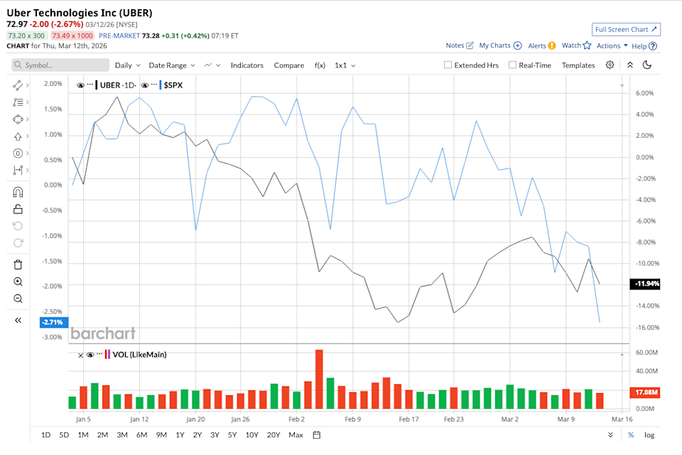 Ride-hailing giant Uber Technologies (UBER) is accelerating its push into autonomous mobility as it expands partnerships with major automakers and tech companies. The company recently teamed up with Nissan (NSANY) and self-driving startup Wayve to launch robotaxis in Tokyo, while also expanding ties with Amazon’s (AMZN) Zoox to deploy autonomous vehicles on its platform. Uber stock is down 10% year-to-date (YTD) and 28.3% from its 52-week high. Is Uber stock a buy as the robotaxi market begins to take shape? Iran War, Fed Conundrum and Other Key Things to Watch this Week NIO Is Outperforming Even as U.S. Stocks Slump: Can the Uptrend Continue? This Stock Has an 18%+ Annual Yield, Pays Monthly, and is Covered by Cash Flow Stop Missing Market Moves: Get the FREE Barchart Brief – your midday dose of stock movers, trending sectors, and actionable trade ideas, delivered right to your inbox. Sign Up Now! On March 12, Uber announced a partnership with Nissan Motor and U.K. autonomous driving startup Wayve to develop robotaxis. The company plans to begin a test program in Tokyo by late 2026. According to the agreement, Nissan will provide electric vehicles (EVs), notably the Nissan Leaf, equipped with Wayve's autonomous driving technology. These vehicles will then operate on the Uber platform, allowing customers in Tokyo to hail robotaxis directly from the Uber app. The initial rollout will be carried out by trained safety drivers inside the vehicles to ensure safe operations. Nissan CEO Ivan Espinosa stated that the launch will determine if the relationship will expand beyond Japan. The Tokyo trial program will be Uber's first AV collaboration in Japan. If successful, it will be a significant step toward the company's larger worldwide robotaxi goals. Prior to this, Uber had announced its partnership with Zoox, Amazon’s self-driving unit. In 2020, the retail and tech giant acquired Zoox for $1.2 billion to develop purpose-built driverless vehicles designed specifically for ride-hailing. These vehicles have no steering wheel or pedals and are designed for totally autonomous operation. Under the partnership agreement, Zoox robotaxis will be available through the Uber platform for eligible trips in the U.S. The company is planning the first deployments in Las Vegas in summer 2026, followed by an expansion to Los Angeles in mid-2027. Uber's strategy is unique. Unlike Waymo and Tesla, which want to manage their own fleets, Uber is adopting a platform strategy. Instead of manufacturing its own AVs, the company intends to collaborate with partners to create a worldwide robotaxi ecosystem. The benefits of this strategy include reduced R&D expenses for building AVs and faster scalability across cities and countries. Furthermore, Uber’s vast network advantage will generate enormous demand. According to the company, early data shows that AVs on Uber’s platform are already showing about 30% higher trips per vehicle per day compared to standalone AV fleets. Uber’s core business is also firing on all cylinders. In the fourth quarter, trips on the platform reached an annual run rate of 15 billion, while the company’s global user base surpassed 200 million monthly active users. Uber’s earnings grew 27% in the quarter to $0.71 per share. The company generated $9.8 billion in free cash flow and ended the quarter with $7.6 billion in unrestricted cash, cash equivalents, and short-term investments. Financially, Uber is well positioned to invest in future growth areas like AVs. AVs have the potential to drastically lower driver costs, which are now one of Uber's highest expenses. In addition, it will increase vehicle utilization. If robotaxis can scale successfully, they might significantly enhance Uber's profitability over time. During its recent Q4 earnings call, management emphasized that AVs could unlock a multi-trillion-dollar opportunity for the company. Uber has already collaborated with over two dozen AV developers, including Waymo, Wayve, Waabi, Nuro, Avride, and Nvidia (NVDA). It intends to launch robotaxi services in up to 15 cities globally by the end of 2026. On Wall Street, UBER stock remains a “Strong Buy." Of the 51 analysts covering UBER, 37 have a “Strong Buy” recommendation, three have a “Moderate Buy” rating, and 10 suggest a “Hold,” and one says it is a “Strong Sell.” Based on the analysts’ average price target of $106.27, UBER stock has upside potential of 45.18% from current levels. Its high price target of $150 suggests the stock can climb as high as 104.9% over the next 12 months. If robotaxis become mainstream over the next decade, Uber’s expanding robotaxi ecosystem could become a powerful long-term growth driver for the company. With strong profitability, accelerating user growth, and a rapidly expanding robotaxi strategy, Uber appears well-positioned for extended expansion, making the stock a good buy on the dip now. On the date of publication, Sushree Mohanty did not have (either directly or indirectly) positions in any of the securities mentioned in this article. All information and data in this article is solely for informational purposes. This article was originally published on Barchart.com