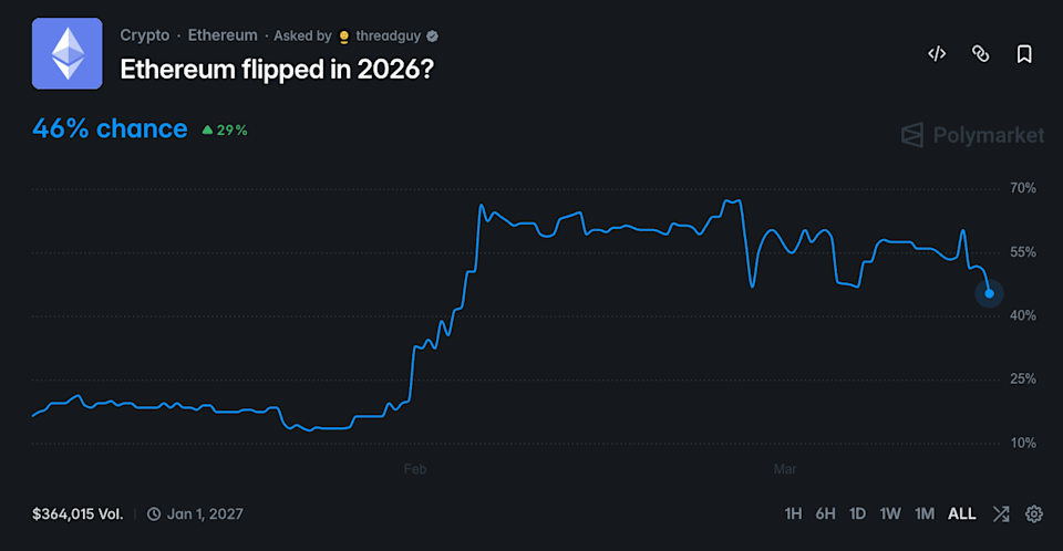 Key Takeaways Polymarket traders are split on Ethereum’s future. AI models point to different challengers. Some analysts remain bullish on Ethereum. The battle for the No. 2 spot in crypto may be heating up again. Ethereum has held its position as the second-largest crypto by market capitalization for years, sitting comfortably behind Bitcoin. But a growing number of traders are beginning to question whether that dominance could finally be challenged in 2026. A popular Polymarket contract is asking whether Ethereum will lose its position as the first- or second-largest cryptocurrency by market capitalization at any point in 2026. The market resolves to “Yes” if ETH falls outside the top two positions between Jan. 1 and Dec. 31, 2026, according to CoinGecko data. Polymarket itself amplified the discussion on X on Saturday, posting: “BREAKING: Ethereum is now projected to lose its spot as the second-largest cryptocurrency. 57% chance Ethereum is flipped this year.” At the time of reporting, the odds have fallen to roughly a 46% probability that Ethereum gets flipped sometime this year. So if Ethereum were to lose its No. 2 ranking, which crypto could take its place? To explore that question, we asked three leading AI models — ChatGPT, Claude, and Grok — what has the best chance of overtaking Ethereum. ChatGPT pointed to BNB as one of the most “realistic” challengers if Ethereum were to lose its No. 2 ranking. According to the AI, BNB benefits from an unusually strong feedback loop between the token and the broader Binance ecosystem. “BNB has a unique advantage because its value is tightly linked to one of the largest crypto exchanges in the world,” ChatGPT said. The AI noted that BNB Chain has quietly maintained a large user base and continues to process significant on-chain activity, especially in decentralized finance and gaming applications. However, ChatGPT emphasized that overtaking Ethereum would still require a major market shift. “Ethereum would likely need to experience prolonged weakness while BNB sees sustained growth,” the model explained. Grok took a blunt tone when discussing Ethereum’s chances of losing its No. 2 ranking. “Solana’s the main contender folks are betting on to flip ETH for the #2 spot this year,” Grok said. The model pointed to Solana’s speed and the surge in network activity — particularly in DeFi and memecoin trading — as reasons some traders see it as the most likely challenger. But Grok also highlighted just how wide the gap currently is. The AI pointed to the current gap: SOL around $70 billion versus ETH above $300 billion. Because of that difference, Grok suggested the scenario remains a long shot, even if excitement around Solana continues to grow. “Polymarket’s hovering around a coin-flip probability for any flip happening in 2026,” the AI added. “Possible? Sure. Easy? Not even close.” Claude took a more measured view, arguing that several projects could theoretically challenge Ethereum, though none have a clear path yet. Claude highlighted XRP as another potential challenger to Ethereum under the right circumstances. The AI noted that XRP has historically held a top-three market position and still commands a massive global user base, particularly in the payments sector. “XRP has one of the longest-standing communities in crypto and a well-established use case around cross-border payments,” Claude said. According to the model, regulatory clarity could play a key role in determining whether XRP has room to surge higher. “If institutional adoption accelerates and regulatory pressure continues to ease, XRP could see renewed momentum that pushes it higher in the rankings,” Claude explained. Still, Claude stressed that overtaking Ethereum would require a dramatic expansion in market value. “Ethereum’s ecosystem depth and developer activity remain major advantages,” the AI added. “Any challenger would need sustained growth to close the gap.” Despite speculation that Ethereum could lose its No. 2 ranking, some analysts remain strongly bullish on ETH’s long-term outlook. Leo Sun, an analyst at The Motley Fool, argues that buying Ethereum today “could set you up for life.” According to Sun, a $1,000 investment in Ether at its earliest trade of around $0.26 in August 2015 would be worth roughly $8.05 million today. That kind of return is difficult to replicate, but Sun believes Ethereum could still deliver significant upside over time. Sun noted that Ethereum still commands the largest developer ecosystem in crypto, with 31,869 active developers at the end of 2025. Although newer proof-of-stake networks such as Solana and Cardano boast faster base-layer speeds, Ethereum has responded by scaling through Layer-2 rollups. Institutional adoption could also play a role in Ethereum’s next growth phase, Sun said. Looking further ahead, Ethereum’s roadmap includes several major upgrades — The Verge, The Purge, and The Splurge — designed to improve scalability, reduce fees, and increase network efficiency. If those upgrades succeed, Sun believes Ethereum could strengthen its position as one of crypto’s “blue-chip” assets. Despite growing competition from rival blockchains, Ethereum’s position as the second-largest crypto remains firmly intact for now, according to CCN analyst Victor Olanrewaju. Olanrewaju said Solana currently represents the most realistic competitive threat to Ethereum’s No. 2 spot, citing its expanding ecosystem and growing developer and user traction. However, he noted that the gap between the two networks remains substantial. He also pointed to XRP as another potential challenger, particularly after regulatory clarity improved the outlook for the token. “XRP is the banker’s choice,” he said, adding that clearer regulation has helped strengthen its positioning in global institutional payments. Still, Olanrewaju emphasized that Ethereum maintains a signifi