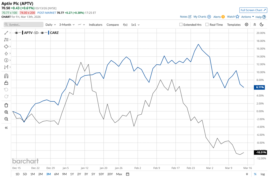 Based in Schaffhausen, Switzerland, Aptiv PLC (APTV) is an industrial technology company that develops hardware and software solutions for the global automotive and mobility markets. Its offerings include advanced safety systems, smart vehicle computing platforms, sensors, connectivity products, and modern electrical architectures that support increasingly software-defined vehicles. With a market cap of approximately $15 billion, Aptiv sits in the “large-cap” category, a class reserved for companies valued above $10 billion. Its global scale and deep involvement in next-generation vehicle technologies place the company at the intersection of automotive engineering and advanced digital mobility systems. NIO Is Outperforming Even as U.S. Stocks Slump: Can the Uptrend Continue? Iran War, Fed Conundrum and Other Key Things to Watch this Week This Stock Has an 18%+ Annual Yield, Pays Monthly, and is Covered by Cash Flow Tired of missing midday reversals? The FREE Barchart Brief newsletter keeps you in the know. Sign up now! APTV stock currently trades 20.7% below its 52-week high of $88.93 reached in January. Over the past three months, the shares have slipped 10.5%. During the same period, the First Trust S-Network Future Vehicles & Technology ETF (CARZ) advanced 6.1%, highlighting the gap between Aptiv’s recent performance and broader automotive sector momentum. The longer-term picture widens that gap. Over the past 52 weeks, APTV stock has gained 13.4%, while CARZ delivered a much stronger 48.5% return. The divergence remains visible in 2026 as well. Year-to-date (YTD), Aptiv's shares are down 7.4%, whereas the automotive benchmark has moved higher by 4.5%. From a technical standpoint, the chart currently leans defensive. The stock has traded below both its 50-day moving average of $78.78 and its 200-day moving average of $76.92 since mid-February. On March 4, however, the company offered the market a strategic development that briefly lifted sentiment. Shares of Aptiv rose 2.8% after management announced the pricing and upsizing of a $1.6 billion private offering of senior notes issued by subsidiaries connected to the Electrical Distribution Systems spin-off. By separating the Electrical Distribution Systems unit, Aptiv intends to sharpen its focus on higher-margin, faster-growing areas such as advanced driver-assistance systems, smart vehicle architectures, and software-driven automotive platforms. That being said, the restructuring clears the runway for Aptiv to concentrate capital and engineering resources on technologies shaping the next generation of vehicles. To place its performance in clearer perspective, rival Autoliv, Inc. (ALV) has gained 17.4% over the past 52 weeks, while its shares are down 13.3% in 2026, highlighting a shift in investor sentiment within the automotive supplier space. Despite the uneven stock performance, Wall Street is optimistic. Among 22 analysts covering the company, APTV carries an overall rating of “Strong Buy.” The mean price target of $100.38 suggests roughly 42.4% upside from current levels. On the date of publication, Aanchal Sugandh did not have (either directly or indirectly) positions in any of the securities mentioned in this article. All information and data in this article is solely for informational purposes. This article was originally published on Barchart.com