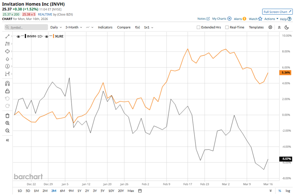 With a market cap of $15.2 billion, Invitation Homes Inc. (INVH) is a leading single-family home leasing and management company in the United States, providing high-quality rental homes close to jobs and good schools. The company focuses on meeting changing lifestyle needs by offering flexible living solutions and valuable home features for residents. Companies valued at $10 billion or more are generally considered "large-cap" stocks, and Invitation Homes fits this criterion perfectly. Its purpose “Unlock the Power of Home” reflects a commitment to providing care and convenience to people who prefer leasing a home. NIO Is Outperforming Even as U.S. Stocks Slump: Can the Uptrend Continue? Iran War, Fed Conundrum and Other Key Things to Watch this Week Uber Expands Robotaxi Empire With Nissan Deal. Is UBER a Buy Now? Our exclusive Barchart Brief newsletter is your FREE midday guide to what's moving stocks, sectors, and investor sentiment - delivered right when you need the info most. Subscribe today! Shares of the Dallas, Texas-based company have decreased 29.7% from its 52-week high of $35.80. Over the past three months, its shares have declined 5.5%, lagging behind the broader State Street Real Estate Select Sector SPDR ETF's (XLRE) 5.5% rise during the same period. INVH stock is down 8.7% on a YTD basis, underperforming XLRE's 6% gain. Longer term, shares of the company have dipped 24.2% over the past 52 weeks, compared to XLRE's 3.2% return over the same time frame. The stock has been trading below its 50-day and 200-day moving averages since late May 2025. Shares of Invitation Homes fell 4.3% following its Q4 2025 results on Feb. 18, with Same Store NOI growth of only 0.7% year-over-year, as core revenues rose 1.7% while operating expenses increased faster at 4%. Investors were also concerned about declining occupancy and weak new lease pricing, with average occupancy falling to 95.9% (down 90 basis points year-over-year) and new lease rent growth dropping to -4.1%, which reduced blended rent growth to 1.8%. In comparison, rival Equity Residential (EQR) has shown a less pronounced decline than INVH stock. EQR stock has dropped 4.3% YTD and 12.5% over the past 52 weeks. Despite the stock’s underperformance, analysts remain moderately optimistic about its prospects. INVH stock has a consensus rating of “Moderate Buy” from 24 analysts in coverage, and the mean price target of $30.60 is a premium of 20.5% to current levels. On the date of publication, Sohini Mondal did not have (either directly or indirectly) positions in any of the securities mentioned in this article. All information and data in this article is solely for informational purposes. This article was originally published on Barchart.com