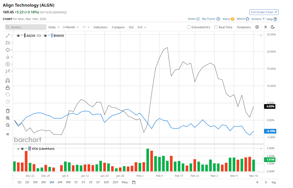 Valued at a market cap of $12.1 billion, Align Technology, Inc. (ALGN) is a medical device leader headquartered in Tempe, Arizona, that pioneered the digital transformation of orthodontics through its flagship Invisalign system. It operates an integrated "Align Digital Platform" that combines advanced 3D software, mass-customized manufacturing, and proprietary materials to treat misaligned teeth without traditional metal braces. Companies valued at $10 billion or more are typically classified as “large-cap stocks,” and ALGN fits the label perfectly, with its market cap exceeding this threshold, underscoring its size, influence, and dominance within the medical instruments & supplies industry. The company has treated over 22 million patients worldwide and continues to expand its ecosystem through iTero intraoral scanners and exocad CAD/CAM software, which provide dentists and orthodontists with a seamless end-to-end digital workflow for restorative and orthodontic care. What Options Traders Expect from Micron Stock After Earnings on March 18 Stocks Set to Open Higher as Bond Yields Fall, Fed Meeting and Middle East Conflict in Focus This Dividend King With a 54-Year Dividend Streak Is Down 13% YTD. Time to Buy the Dip? Get exclusive insights with the FREE Barchart Brief newsletter. Subscribe now for quick, incisive midday market analysis you won't find anywhere else. This dental care leader is currently trading 18.7% below its 52-week high of $208.31, reached on Jul. 29, 2025. Shares of ALGN have soared 4% over the past three months, outperforming the Nasdaq Composite’s ($NASX) 3.2% drop during the same time frame. Moreover, on a YTD basis, shares of ALGN are up 8.5%, compared to NASX’s 3.7% fall. However, in the longer term, ALGN has gained 2% over the past 52 weeks, trailing NASX’s 26% uptick over the same time frame. To confirm its bullish trend, ALGN has been trading above its 200-day moving average since early January, with slight fluctuations. However, it has started trading below its 50-day moving average since early March. After ALGN reported its Q4 results on Feb. 4, investor sentiment improved noticeably. The stock gained 2.7% on the day of the announcement and continued its upward trend, rising another 8.9% and 6.8% over the following two sessions. Its revenue came in at $1.05 billion, reflecting a 5.3% year-over-year increase and slightly beating analyst expectations of $1.03 billion. Meanwhile, its adjusted EPS climbed 34.8% to $3.29, comfortably ahead of the $2.97 consensus estimate. The strong performance was mainly supported by continued traction in dental service organizations (DSOs) and solid demand for clear aligners. ALGN has considerably outperformed its rival, DENTSPLY SIRONA Inc. (XRAY), which declined 24.6% over the past 52 weeks and gained 2.6% on a YTD basis. Given ALGN’s recent outperformance, analysts remain moderately optimistic about its prospects. The stock has a consensus rating of "Moderate Buy” from the 15 analysts covering it, and the mean price target of $200.15 suggests an 18.1% premium to its current price levels. On the date of publication, Neharika Jain did not have (either directly or indirectly) positions in any of the securities mentioned in this article. All information and data in this article is solely for informational purposes. This article was originally published on Barchart.com